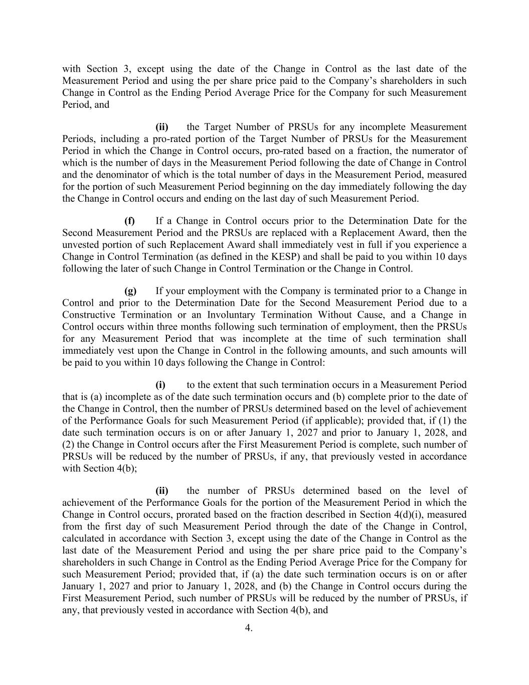4. with Section 3, except using the date of the Change in Control as the last date of the Measurement Period and using the per share price paid to the Company’s shareholders in such Change in Control as the Ending Period Average Price for the Company for such Measurement Period, and (ii) the Target Number of PRSUs for any incomplete Measurement Periods, including a pro-rated portion of the Target Number of PRSUs for the Measurement Period in which the Change in Control occurs, pro-rated based on a fraction, the numerator of which is the number of days in the Measurement Period following the date of Change in Control and the denominator of which is the total number of days in the Measurement Period, measured for the portion of such Measurement Period beginning on the day immediately following the day the Change in Control occurs and ending on the last day of such Measurement Period. (f) If a Change in Control occurs prior to the Determination Date for the Second Measurement Period and the PRSUs are replaced with a Replacement Award, then the unvested portion of such Replacement Award shall immediately vest in full if you experience a Change in Control Termination (as defined in the KESP) and shall be paid to you within 10 days following the later of such Change in Control Termination or the Change in Control. (g) If your employment with the Company is terminated prior to a Change in Control and prior to the Determination Date for the Second Measurement Period due to a Constructive Termination or an Involuntary Termination Without Cause, and a Change in Control occurs within three months following such termination of employment, then the PRSUs for any Measurement Period that was incomplete at the time of such termination shall immediately vest upon the Change in Control in the following amounts, and such amounts will be paid to you within 10 days following the Change in Control: (i) to the extent that such termination occurs in a Measurement Period that is (a) incomplete as of the date such termination occurs and (b) complete prior to the date of the Change in Control, then the number of PRSUs determined based on the level of achievement of the Performance Goals for such Measurement Period (if applicable); provided that, if (1) the date such termination occurs is on or after January 1, 2027 and prior to January 1, 2028, and (2) the Change in Control occurs after the First Measurement Period is complete, such number of PRSUs will be reduced by the number of PRSUs, if any, that previously vested in accordance with Section 4(b); (ii) the number of PRSUs determined based on the level of achievement of the Performance Goals for the portion of the Measurement Period in which the Change in Control occurs, prorated based on the fraction described in Section 4(d)(i), measured from the first day of such Measurement Period through the date of the Change in Control, calculated in accordance with Section 3, except using the date of the Change in Control as the last date of the Measurement Period and using the per share price paid to the Company’s shareholders in such Change in Control as the Ending Period Average Price for the Company for such Measurement Period; provided that, if (a) the date such termination occurs is on or after January 1, 2027 and prior to January 1, 2028, and (b) the Change in Control occurs during the First Measurement Period, such number of PRSUs will be reduced by the number of PRSUs, if any, that previously vested in accordance with Section 4(b), and