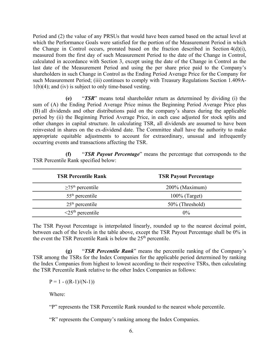 6. Period and (2) the value of any PRSUs that would have been earned based on the actual level at which the Performance Goals were satisfied for the portion of the Measurement Period in which the Change in Control occurs, prorated based on the fraction described in Section 4(d)(i), measured from the first day of such Measurement Period to the date of the Change in Control, calculated in accordance with Section 3, except using the date of the Change in Control as the last date of the Measurement Period and using the per share price paid to the Company’s shareholders in such Change in Control as the Ending Period Average Price for the Company for such Measurement Period; (iii) continues to comply with Treasury Regulations Section 1.409A- 1(b)(4); and (iv) is subject to only time-based vesting. (e) “TSR” means total shareholder return as determined by dividing (i) the sum of (A) the Ending Period Average Price minus the Beginning Period Average Price plus (B) all dividends and other distributions paid on the company’s shares during the applicable period by (ii) the Beginning Period Average Price, in each case adjusted for stock splits and other changes in capital structure. In calculating TSR, all dividends are assumed to have been reinvested in shares on the ex-dividend date. The Committee shall have the authority to make appropriate equitable adjustments to account for extraordinary, unusual and infrequently occurring events and transactions affecting the TSR. (f) “TSR Payout Percentage” means the percentage that corresponds to the TSR Percentile Rank specified below: TSR Percentile Rank TSR Payout Percentage ≥75th percentile 200% (Maximum) 55th percentile 100% (Target) 25th percentile 50% (Threshold) <25th percentile 0% The TSR Payout Percentage is interpolated linearly, rounded up to the nearest decimal point, between each of the levels in the table above, except the TSR Payout Percentage shall be 0% in the event the TSR Percentile Rank is below the 25th percentile. (g) “TSR Percentile Rank” means the percentile ranking of the Company’s TSR among the TSRs for the Index Companies for the applicable period determined by ranking the Index Companies from highest to lowest according to their respective TSRs, then calculating the TSR Percentile Rank relative to the other Index Companies as follows: P = 1 - ((R-1)/(N-1)) Where: “P” represents the TSR Percentile Rank rounded to the nearest whole percentile. “R” represents the Company’s ranking among the Index Companies.
