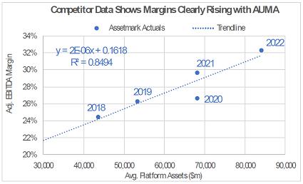 Analyzing Wealth competitors with similar platform models reveals a clear link between AUMA and profitability. For example, AssetMark’s Adjusted EBITDA margin was 24% in 2018, based on AUMA of $44 billion, and 32% by 2022, as AUMA had risen to $84 billion. [***].