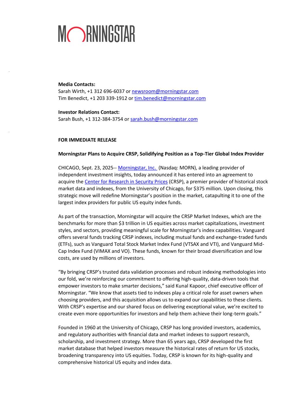 Media Contacts: Sarah Wirth, +1 312 696-6037 or newsroom@morningstar.com Tim Benedict, +1 203 339-1912 or tim.benedict@morningstar.com Investor Relations Contact: Sarah Bush, +1 312-384-3754 or sarah.bush@morningstar.com FOR IMMEDIATE RELEASE Morningstar Plans to Acquire CRSP, Solidifying Position as a Top-Tier Global Index Provider CHICAGO, Sept. 23, 2025-- Morningstar, Inc. (Nasdaq: MORN), a leading provider of independent investment insights, today announced it has entered into an agreement to acquire the Center for Research in Security Prices (CRSP), a premier provider of historical stock market data and indexes, from the University of Chicago, for $375 million. Upon closing, this strategic move will redefine Morningstar’s position in the market, catapulting it to one of the largest index providers for public US equity index funds. As part of the transaction, Morningstar will acquire the CRSP Market Indexes, which are the benchmarks for more than $3 trillion in US equities across market capitalizations, investment styles, and sectors, providing meaningful scale for Morningstar’s index capabilities. Vanguard offers several funds tracking CRSP indexes, including mutual funds and exchange-traded funds (ETFs), such as Vanguard Total Stock Market Index Fund (VTSAX and VTI), and Vanguard Mid- Cap Index Fund (VIMAX and VO). These funds, known for their broad diversification and low costs, are used by millions of investors. “By bringing CRSP’s trusted data validation processes and robust indexing methodologies into our fold, we’re reinforcing our commitment to offering high-quality, data-driven tools that empower investors to make smarter decisions,” said Kunal Kapoor, chief executive officer of Morningstar. “We know that assets tied to indexes play a critical role for asset owners when choosing providers, and this acquisition allows us to expand our capabilities to these clients. With CRSP’s expertise and our shared focus on delivering exceptional value, we’re excited to create even more opportunities for investors and help them achieve their long-term goals.” Founded in 1960 at the University of Chicago, CRSP has long provided investors, academics, and regulatory authorities with financial data and market indexes to support research, scholarship, and investment strategy. More than 65 years ago, CRSP developed the first market database that helped investors measure the historical rates of return for US stocks, broadening transparency into US equities. Today, CRSP is known for its high-quality and comprehensive historical US equity and index data.