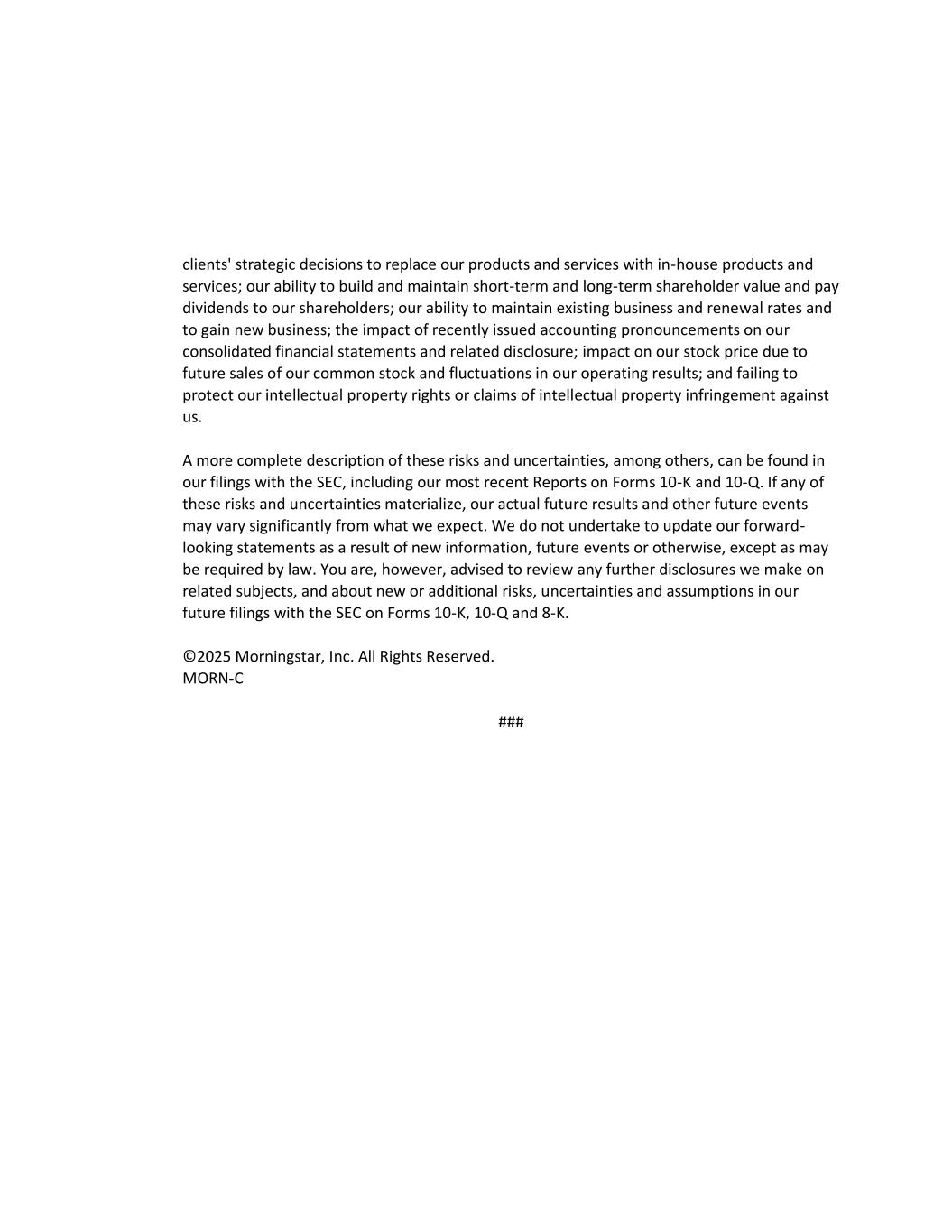 clients' strategic decisions to replace our products and services with in-house products and services; our ability to build and maintain short-term and long-term shareholder value and pay dividends to our shareholders; our ability to maintain existing business and renewal rates and to gain new business; the impact of recently issued accounting pronouncements on our consolidated financial statements and related disclosure; impact on our stock price due to future sales of our common stock and fluctuations in our operating results; and failing to protect our intellectual property rights or claims of intellectual property infringement against us. A more complete description of these risks and uncertainties, among others, can be found in our filings with the SEC, including our most recent Reports on Forms 10-K and 10-Q. If any of these risks and uncertainties materialize, our actual future results and other future events may vary significantly from what we expect. We do not undertake to update our forward- looking statements as a result of new information, future events or otherwise, except as may be required by law. You are, however, advised to review any further disclosures we make on related subjects, and about new or additional risks, uncertainties and assumptions in our future filings with the SEC on Forms 10-K, 10-Q and 8-K. ©2025 Morningstar, Inc. All Rights Reserved. MORN-C ###