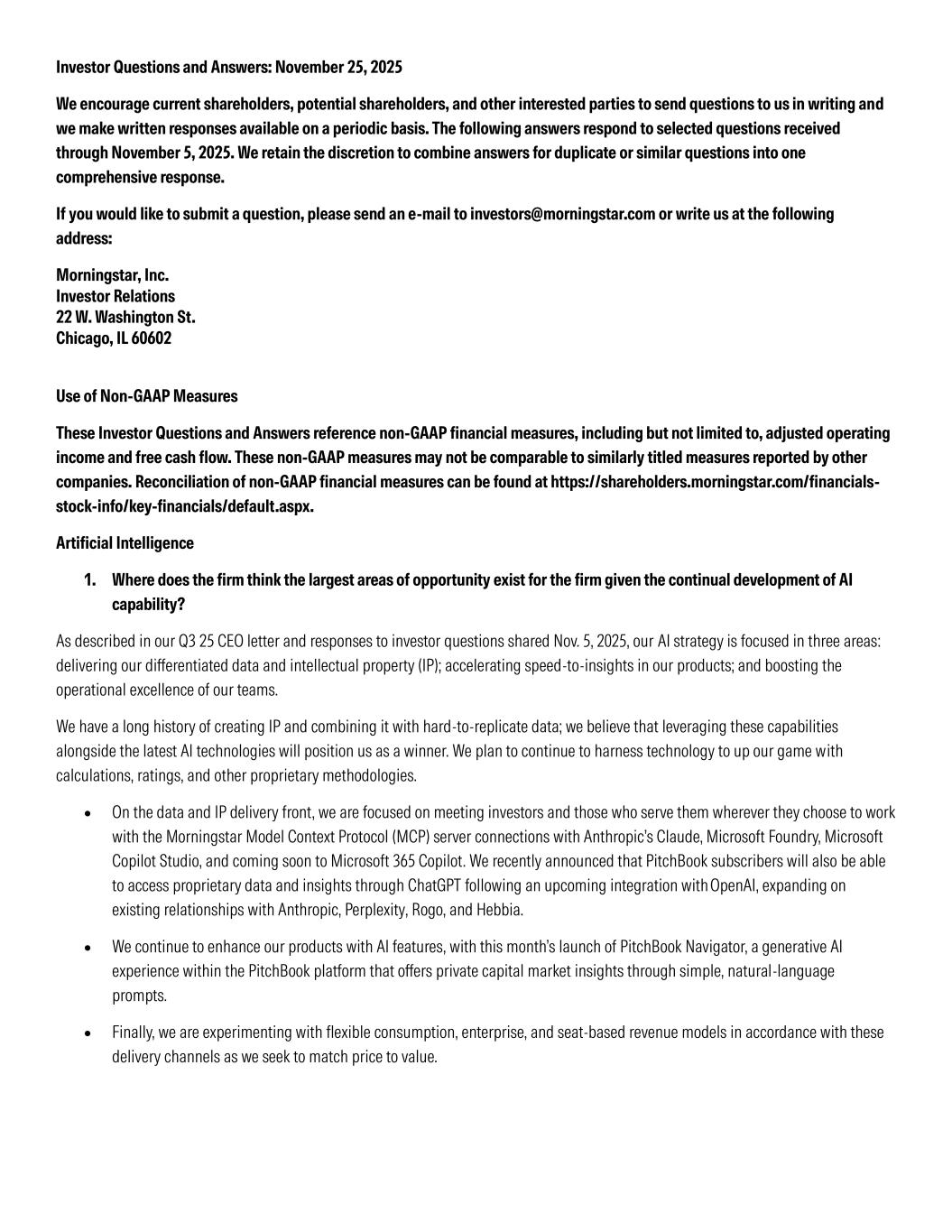 Investor Questions and Answers: November 25, 2025 We encourage current shareholders, potential shareholders, and other interested parties to send questions to us in writing and we make written responses available on a periodic basis. The following answers respond to selected questions received through November 5, 2025. We retain the discretion to combine answers for duplicate or similar questions into one comprehensive response. If you would like to submit a question, please send an e-mail to investors@morningstar.com or write us at the following address: Morningstar, Inc. Investor Relations 22 W. Washington St. Chicago, IL 60602 Use of Non-GAAP Measures These Investor Questions and Answers reference non-GAAP financial measures, including but not limited to, adjusted operating income and free cash flow. These non-GAAP measures may not be comparable to similarly titled measures reported by other companies. Reconciliation of non-GAAP financial measures can be found at https://shareholders.morningstar.com/financials- stock-info/key-financials/default.aspx. Artificial Intelligence 1. Where does the firm think the largest areas of opportunity exist for the firm given the continual development of AI capability? As described in our Q3 25 CEO letter and responses to investor questions shared Nov. 5, 2025, our AI strategy is focused in three areas: delivering our differentiated data and intellectual property (IP); accelerating speed-to-insights in our products; and boosting the operational excellence of our teams. We have a long history of creating IP and combining it with hard-to-replicate data; we believe that leveraging these capabilities alongside the latest AI technologies will position us as a winner. We plan to continue to harness technology to up our game with calculations, ratings, and other proprietary methodologies. • On the data and IP delivery front, we are focused on meeting investors and those who serve them wherever they choose to work with the Morningstar Model Context Protocol (MCP) server connections with Anthropic’s Claude, Microsoft Foundry, Microsoft Copilot Studio, and coming soon to Microsoft 365 Copilot. We recently announced that PitchBook subscribers will also be able to access proprietary data and insights through ChatGPT following an upcoming integration with OpenAI, expanding on existing relationships with Anthropic, Perplexity, Rogo, and Hebbia. • We continue to enhance our products with AI features, with this month’s launch of PitchBook Navigator, a generative AI experience within the PitchBook platform that offers private capital market insights through simple, natural-language prompts. • Finally, we are experimenting with flexible consumption, enterprise, and seat-based revenue models in accordance with these delivery channels as we seek to match price to value.