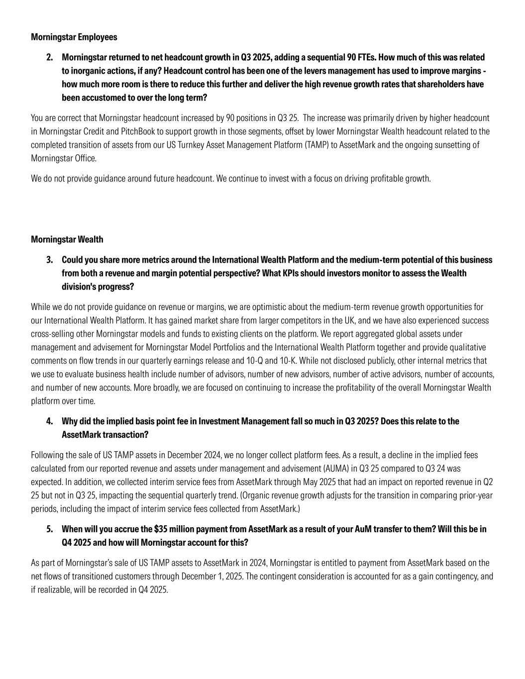 Morningstar Employees 2. Morningstar returned to net headcount growth in Q3 2025, adding a sequential 90 FTEs. How much of this was related to inorganic actions, if any? Headcount control has been one of the levers management has used to improve margins - how much more room is there to reduce this further and deliver the high revenue growth rates that shareholders have been accustomed to over the long term? You are correct that Morningstar headcount increased by 90 positions in Q3 25. The increase was primarily driven by higher headcount in Morningstar Credit and PitchBook to support growth in those segments, offset by lower Morningstar Wealth headcount related to the completed transition of assets from our US Turnkey Asset Management Platform (TAMP) to AssetMark and the ongoing sunsetting of Morningstar Office. We do not provide guidance around future headcount. We continue to invest with a focus on driving profitable growth. Morningstar Wealth 3. Could you share more metrics around the International Wealth Platform and the medium-term potential of this business from both a revenue and margin potential perspective? What KPIs should investors monitor to assess the Wealth division's progress? While we do not provide guidance on revenue or margins, we are optimistic about the medium-term revenue growth opportunities for our International Wealth Platform. It has gained market share from larger competitors in the UK, and we have also experienced success cross-selling other Morningstar models and funds to existing clients on the platform. We report aggregated global assets under management and advisement for Morningstar Model Portfolios and the International Wealth Platform together and provide qualitative comments on flow trends in our quarterly earnings release and 10-Q and 10-K. While not disclosed publicly, other internal metrics that we use to evaluate business health include number of advisors, number of new advisors, number of active advisors, number of accounts, and number of new accounts. More broadly, we are focused on continuing to increase the profitability of the overall Morningstar Wealth platform over time. 4. Why did the implied basis point fee in Investment Management fall so much in Q3 2025? Does this relate to the AssetMark transaction? Following the sale of US TAMP assets in December 2024, we no longer collect platform fees. As a result, a decline in the implied fees calculated from our reported revenue and assets under management and advisement (AUMA) in Q3 25 compared to Q3 24 was expected. In addition, we collected interim service fees from AssetMark through May 2025 that had an impact on reported revenue in Q2 25 but not in Q3 25, impacting the sequential quarterly trend. (Organic revenue growth adjusts for the transition in comparing prior-year periods, including the impact of interim service fees collected from AssetMark.) 5. When will you accrue the $35 million payment from AssetMark as a result of your AuM transfer to them? Will this be in Q4 2025 and how will Morningstar account for this? As part of Morningstar’s sale of US TAMP assets to AssetMark in 2024, Morningstar is entitled to payment from AssetMark based on the net flows of transitioned customers through December 1, 2025. The contingent consideration is accounted for as a gain contingency, and if realizable, will be recorded in Q4 2025.