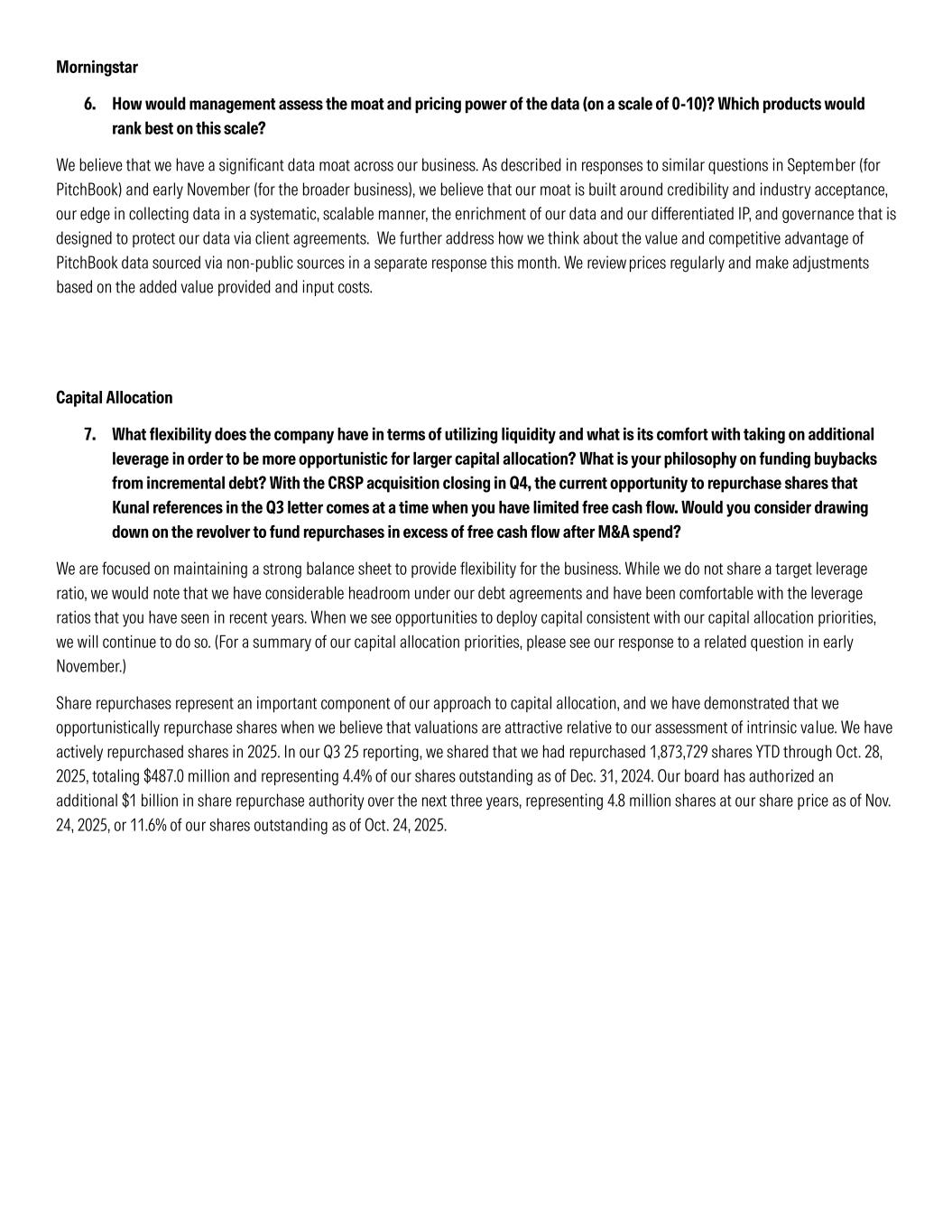 Morningstar 6. How would management assess the moat and pricing power of the data (on a scale of 0-10)? Which products would rank best on this scale? We believe that we have a significant data moat across our business. As described in responses to similar questions in September (for PitchBook) and early November (for the broader business), we believe that our moat is built around credibility and industry acceptance, our edge in collecting data in a systematic, scalable manner, the enrichment of our data and our differentiated IP, and governance that is designed to protect our data via client agreements. We further address how we think about the value and competitive advantage of PitchBook data sourced via non-public sources in a separate response this month. We review prices regularly and make adjustments based on the added value provided and input costs. Capital Allocation 7. What flexibility does the company have in terms of utilizing liquidity and what is its comfort with taking on additional leverage in order to be more opportunistic for larger capital allocation? What is your philosophy on funding buybacks from incremental debt? With the CRSP acquisition closing in Q4, the current opportunity to repurchase shares that Kunal references in the Q3 letter comes at a time when you have limited free cash flow. Would you consider drawing down on the revolver to fund repurchases in excess of free cash flow after M&A spend? We are focused on maintaining a strong balance sheet to provide flexibility for the business. While we do not share a target leverage ratio, we would note that we have considerable headroom under our debt agreements and have been comfortable with the leverage ratios that you have seen in recent years. When we see opportunities to deploy capital consistent with our capital allocation priorities, we will continue to do so. (For a summary of our capital allocation priorities, please see our response to a related question in early November.) Share repurchases represent an important component of our approach to capital allocation, and we have demonstrated that we opportunistically repurchase shares when we believe that valuations are attractive relative to our assessment of intrinsic value. We have actively repurchased shares in 2025. In our Q3 25 reporting, we shared that we had repurchased 1,873,729 shares YTD through Oct. 28, 2025, totaling $487.0 million and representing 4.4% of our shares outstanding as of Dec. 31, 2024. Our board has authorized an additional $1 billion in share repurchase authority over the next three years, representing 4.8 million shares at our share price as of Nov. 24, 2025, or 11.6% of our shares outstanding as of Oct. 24, 2025.