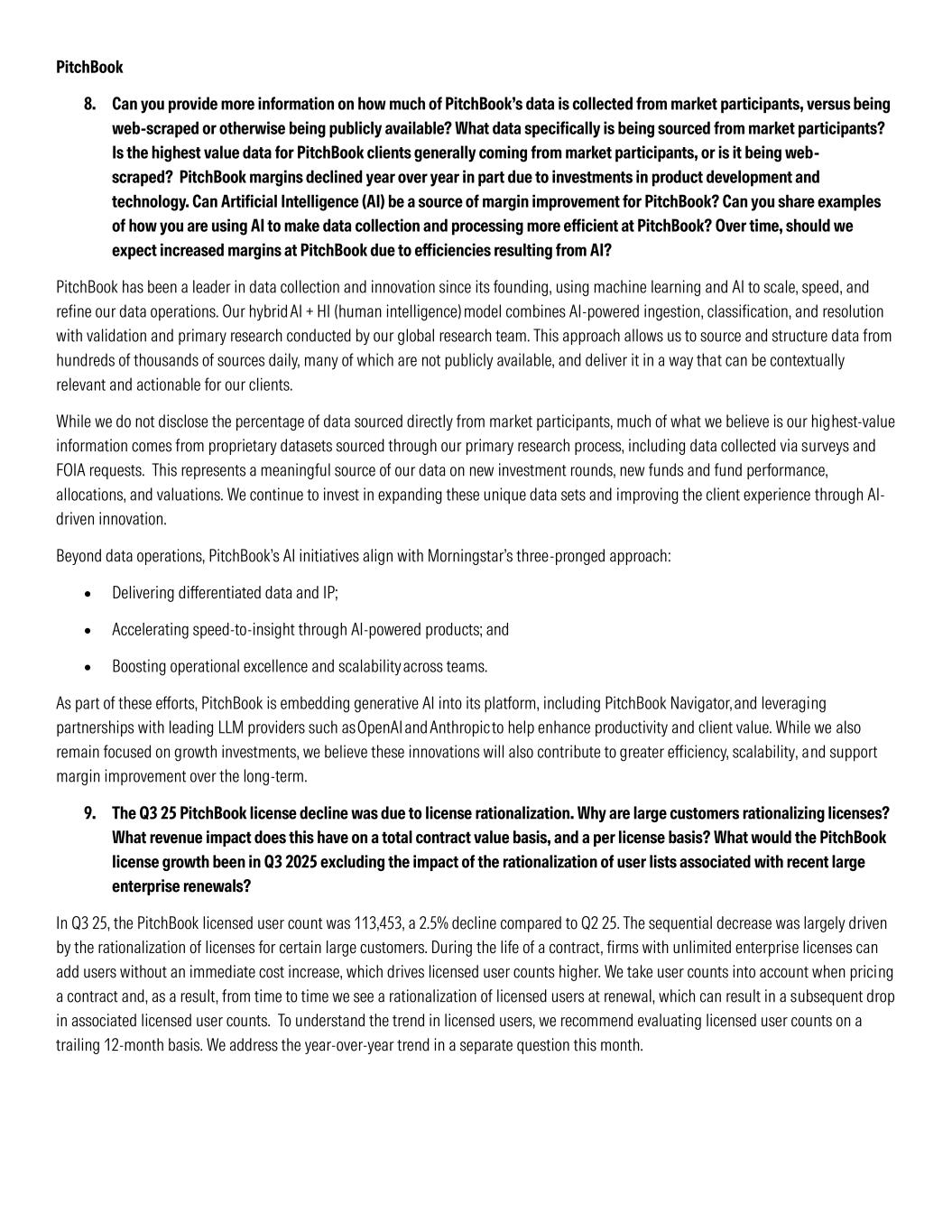PitchBook 8. Can you provide more information on how much of PitchBook’s data is collected from market participants, versus being web-scraped or otherwise being publicly available? What data specifically is being sourced from market participants? Is the highest value data for PitchBook clients generally coming from market participants, or is it being web- scraped? PitchBook margins declined year over year in part due to investments in product development and technology. Can Artificial Intelligence (AI) be a source of margin improvement for PitchBook? Can you share examples of how you are using AI to make data collection and processing more efficient at PitchBook? Over time, should we expect increased margins at PitchBook due to efficiencies resulting from AI? PitchBook has been a leader in data collection and innovation since its founding, using machine learning and AI to scale, speed, and refine our data operations. Our hybrid AI + HI (human intelligence) model combines AI-powered ingestion, classification, and resolution with validation and primary research conducted by our global research team. This approach allows us to source and structure data from hundreds of thousands of sources daily, many of which are not publicly available, and deliver it in a way that can be contextually relevant and actionable for our clients. While we do not disclose the percentage of data sourced directly from market participants, much of what we believe is our highest-value information comes from proprietary datasets sourced through our primary research process, including data collected via surveys and FOIA requests. This represents a meaningful source of our data on new investment rounds, new funds and fund performance, allocations, and valuations. We continue to invest in expanding these unique data sets and improving the client experience through AI- driven innovation. Beyond data operations, PitchBook’s AI initiatives align with Morningstar’s three-pronged approach: • Delivering differentiated data and IP; • Accelerating speed-to-insight through AI-powered products; and • Boosting operational excellence and scalability across teams. As part of these efforts, PitchBook is embedding generative AI into its platform, including PitchBook Navigator, and leveraging partnerships with leading LLM providers such as OpenAI and Anthropic to help enhance productivity and client value. While we also remain focused on growth investments, we believe these innovations will also contribute to greater efficiency, scalability, and support margin improvement over the long-term. 9. The Q3 25 PitchBook license decline was due to license rationalization. Why are large customers rationalizing licenses? What revenue impact does this have on a total contract value basis, and a per license basis? What would the PitchBook license growth been in Q3 2025 excluding the impact of the rationalization of user lists associated with recent large enterprise renewals? In Q3 25, the PitchBook licensed user count was 113,453, a 2.5% decline compared to Q2 25. The sequential decrease was largely driven by the rationalization of licenses for certain large customers. During the life of a contract, firms with unlimited enterprise licenses can add users without an immediate cost increase, which drives licensed user counts higher. We take user counts into account when pricing a contract and, as a result, from time to time we see a rationalization of licensed users at renewal, which can result in a subsequent drop in associated licensed user counts. To understand the trend in licensed users, we recommend evaluating licensed user counts on a trailing 12-month basis. We address the year-over-year trend in a separate question this month.