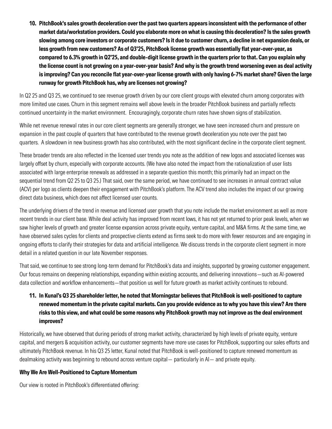 10. PitchBook's sales growth deceleration over the past two quarters appears inconsistent with the performance of other market data/workstation providers. Could you elaborate more on what is causing this deceleration? Is the sales growth slowing among core investors or corporate customers? Is it due to customer churn, a decline in net expansion deals, or less growth from new customers? As of Q3’25, PitchBook license growth was essentially flat year-over-year, as compared to 6.3% growth in Q2’25, and double-digit license growth in the quarters prior to that. Can you explain why the license count is not growing on a year-over-year basis? And why is the growth trend worsening even as deal activity is improving? Can you reconcile flat year-over-year license growth with only having 6-7% market share? Given the large runway for growth PitchBook has, why are licenses not growing? In Q2 25 and Q3 25, we continued to see revenue growth driven by our core client groups with elevated churn among corporates with more limited use cases. Churn in this segment remains well above levels in the broader PitchBook business and partially reflects continued uncertainty in the market environment. Encouragingly, corporate churn rates have shown signs of stabilization. While net revenue renewal rates in our core client segments are generally stronger, we have seen increased churn and pressure on expansion in the past couple of quarters that have contributed to the revenue growth deceleration you note over the past two quarters. A slowdown in new business growth has also contributed, with the most significant decline in the corporate client segment. These broader trends are also reflected in the licensed user trends you note as the addition of new logos and associated licenses was largely offset by churn, especially with corporate accounts. (We have also noted the impact from the rationalization of user lists associated with large enterprise renewals as addressed in a separate question this month; this primarily had an impact on the sequential trend from Q2 25 to Q3 25.) That said, over the same period, we have continued to see increases in annual contract value (ACV) per logo as clients deepen their engagement with PitchBook’s platform. The ACV trend also includes the impact of our growing direct data business, which does not affect licensed user counts. The underlying drivers of the trend in revenue and licensed user growth that you note include the market environment as well as more recent trends in our client base. While deal activity has improved from recent lows, it has not yet returned to prior peak levels, when we saw higher levels of growth and greater license expansion across private equity, venture capital, and M&A firms. At the same time, we have observed sales cycles for clients and prospective clients extend as firms seek to do more with fewer resources and are engaging in ongoing efforts to clarify their strategies for data and artificial intelligence. We discuss trends in the corporate client segment in more detail in a related question in our late November responses. That said, we continue to see strong long-term demand for PitchBook’s data and insights, supported by growing customer engagement. Our focus remains on deepening relationships, expanding within existing accounts, and delivering innovations—such as AI-powered data collection and workflow enhancements—that position us well for future growth as market activity continues to rebound. 11. In Kunal’s Q3 25 shareholder letter, he noted that Morningstar believes that PitchBook is well-positioned to capture renewed momentum in the private capital markets. Can you provide evidence as to why you have this view? Are there risks to this view, and what could be some reasons why PitchBook growth may not improve as the deal environment improves? Historically, we have observed that during periods of strong market activity, characterized by high levels of private equity, venture capital, and mergers & acquisition activity, our customer segments have more use cases for PitchBook, supporting our sales efforts and ultimately PitchBook revenue. In his Q3 25 letter, Kunal noted that PitchBook is well-positioned to capture renewed momentum as dealmaking activity was beginning to rebound across venture capital— particularly in AI— and private equity. Why We Are Well-Positioned to Capture Momentum Our view is rooted in PitchBook’s differentiated offering: