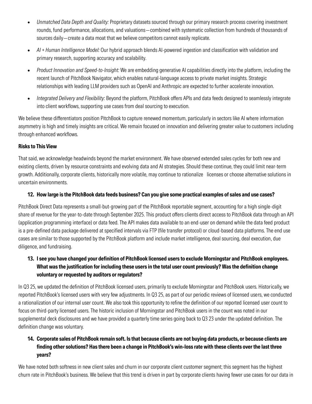 • Unmatched Data Depth and Quality: Proprietary datasets sourced through our primary research process covering investment rounds, fund performance, allocations, and valuations—combined with systematic collection from hundreds of thousands of sources daily—create a data moat that we believe competitors cannot easily replicate. • AI + Human Intelligence Model: Our hybrid approach blends AI-powered ingestion and classification with validation and primary research, supporting accuracy and scalability. • Product Innovation and Speed-to-Insight: We are embedding generative AI capabilities directly into the platform, including the recent launch of PitchBook Navigator, which enables natural-language access to private market insights. Strategic relationships with leading LLM providers such as OpenAI and Anthropic are expected to further accelerate innovation. • Integrated Delivery and Flexibility: Beyond the platform, PitchBook offers APIs and data feeds designed to seamlessly integrate into client workflows, supporting use cases from deal sourcing to execution. We believe these differentiators position PitchBook to capture renewed momentum, particularly in sectors like AI where information asymmetry is high and timely insights are critical. We remain focused on innovation and delivering greater value to customers including through enhanced workflows. Risks to This View That said, we acknowledge headwinds beyond the market environment. We have observed extended sales cycles for both new and existing clients, driven by resource constraints and evolving data and AI strategies. Should these continue, they could limit near-term growth. Additionally, corporate clients, historically more volatile, may continue to rationalize licenses or choose alternative solutions in uncertain environments. 12. How large is the PitchBook data feeds business? Can you give some practical examples of sales and use cases? PitchBook Direct Data represents a small-but-growing part of the PitchBook reportable segment, accounting for a high single-digit share of revenue for the year-to-date through September 2025. This product offers clients direct access to PitchBook data through an API (application programming interface) or data feed. The API makes data available to an end-user on demand while the data feed product is a pre-defined data package delivered at specified intervals via FTP (file transfer protocol) or cloud-based data platforms. The end use cases are similar to those supported by the PitchBook platform and include market intelligence, deal sourcing, deal execution, due diligence, and fundraising. 13. I see you have changed your definition of PitchBook licensed users to exclude Morningstar and PitchBook employees. What was the justification for including these users in the total user count previously? Was the definition change voluntary or requested by auditors or regulators? In Q3 25, we updated the definition of PitchBook licensed users, primarily to exclude Morningstar and PitchBook users. Historically, we reported PitchBook’s licensed users with very few adjustments. In Q3 25, as part of our periodic reviews of licensed users, we conducted a rationalization of our internal user count. We also took this opportunity to refine the definition of our reported licensed user count to focus on third-party licensed users. The historic inclusion of Morningstar and PitchBook users in the count was noted in our supplemental deck disclosures and we have provided a quarterly time series going back to Q3 23 under the updated definition. The definition change was voluntary. 14. Corporate sales of PitchBook remain soft. Is that because clients are not buying data products, or because clients are finding other solutions? Has there been a change in PitchBook’s win-loss rate with these clients over the last three years? We have noted both softness in new client sales and churn in our corporate client customer segment; this segment has the highest churn rate in PitchBook’s business. We believe that this trend is driven in part by corporate clients having fewer use cases for our data in