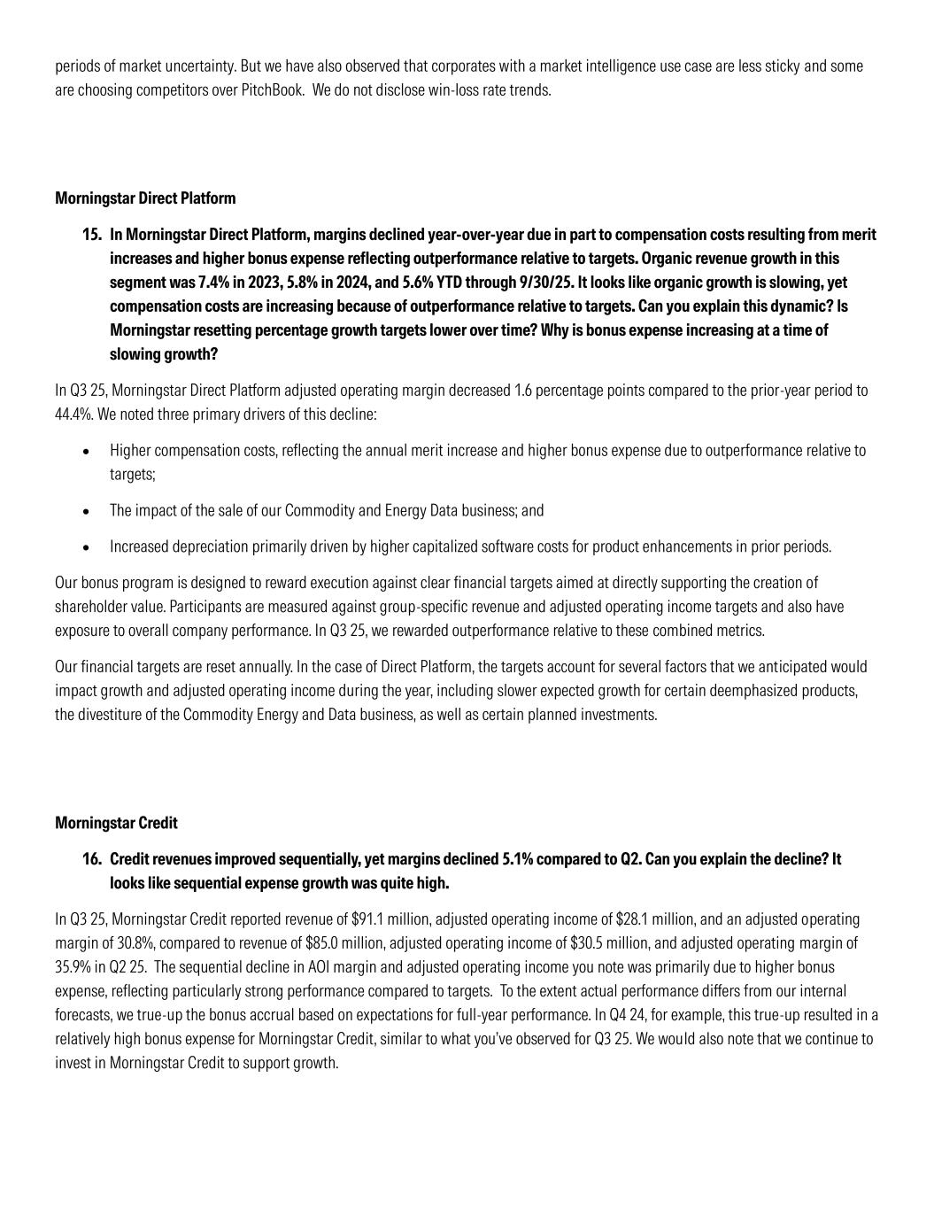 periods of market uncertainty. But we have also observed that corporates with a market intelligence use case are less sticky and some are choosing competitors over PitchBook. We do not disclose win-loss rate trends. Morningstar Direct Platform 15. In Morningstar Direct Platform, margins declined year-over-year due in part to compensation costs resulting from merit increases and higher bonus expense reflecting outperformance relative to targets. Organic revenue growth in this segment was 7.4% in 2023, 5.8% in 2024, and 5.6% YTD through 9/30/25. It looks like organic growth is slowing, yet compensation costs are increasing because of outperformance relative to targets. Can you explain this dynamic? Is Morningstar resetting percentage growth targets lower over time? Why is bonus expense increasing at a time of slowing growth? In Q3 25, Morningstar Direct Platform adjusted operating margin decreased 1.6 percentage points compared to the prior-year period to 44.4%. We noted three primary drivers of this decline: • Higher compensation costs, reflecting the annual merit increase and higher bonus expense due to outperformance relative to targets; • The impact of the sale of our Commodity and Energy Data business; and • Increased depreciation primarily driven by higher capitalized software costs for product enhancements in prior periods. Our bonus program is designed to reward execution against clear financial targets aimed at directly supporting the creation of shareholder value. Participants are measured against group-specific revenue and adjusted operating income targets and also have exposure to overall company performance. In Q3 25, we rewarded outperformance relative to these combined metrics. Our financial targets are reset annually. In the case of Direct Platform, the targets account for several factors that we anticipated would impact growth and adjusted operating income during the year, including slower expected growth for certain deemphasized products, the divestiture of the Commodity Energy and Data business, as well as certain planned investments. Morningstar Credit 16. Credit revenues improved sequentially, yet margins declined 5.1% compared to Q2. Can you explain the decline? It looks like sequential expense growth was quite high. In Q3 25, Morningstar Credit reported revenue of $91.1 million, adjusted operating income of $28.1 million, and an adjusted operating margin of 30.8%, compared to revenue of $85.0 million, adjusted operating income of $30.5 million, and adjusted operating margin of 35.9% in Q2 25. The sequential decline in AOI margin and adjusted operating income you note was primarily due to higher bonus expense, reflecting particularly strong performance compared to targets. To the extent actual performance differs from our internal forecasts, we true-up the bonus accrual based on expectations for full-year performance. In Q4 24, for example, this true-up resulted in a relatively high bonus expense for Morningstar Credit, similar to what you’ve observed for Q3 25. We would also note that we continue to invest in Morningstar Credit to support growth.