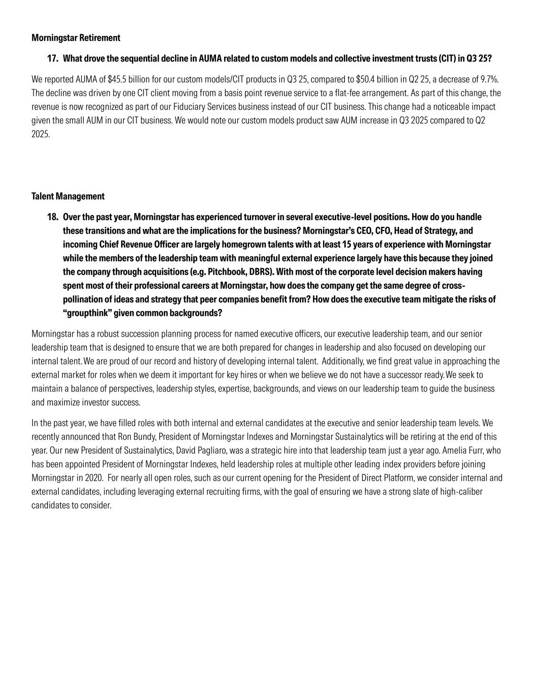 Morningstar Retirement 17. What drove the sequential decline in AUMA related to custom models and collective investment trusts (CIT) in Q3 25? We reported AUMA of $45.5 billion for our custom models/CIT products in Q3 25, compared to $50.4 billion in Q2 25, a decrease of 9.7%. The decline was driven by one CIT client moving from a basis point revenue service to a flat-fee arrangement. As part of this change, the revenue is now recognized as part of our Fiduciary Services business instead of our CIT business. This change had a noticeable impact given the small AUM in our CIT business. We would note our custom models product saw AUM increase in Q3 2025 compared to Q2 2025. Talent Management 18. Over the past year, Morningstar has experienced turnover in several executive-level positions. How do you handle these transitions and what are the implications for the business? Morningstar’s CEO, CFO, Head of Strategy, and incoming Chief Revenue Officer are largely homegrown talents with at least 15 years of experience with Morningstar while the members of the leadership team with meaningful external experience largely have this because they joined the company through acquisitions (e.g. Pitchbook, DBRS). With most of the corporate level decision makers having spent most of their professional careers at Morningstar, how does the company get the same degree of cross- pollination of ideas and strategy that peer companies benefit from? How does the executive team mitigate the risks of “groupthink” given common backgrounds? Morningstar has a robust succession planning process for named executive officers, our executive leadership team, and our senior leadership team that is designed to ensure that we are both prepared for changes in leadership and also focused on developing our internal talent. We are proud of our record and history of developing internal talent. Additionally, we find great value in approaching the external market for roles when we deem it important for key hires or when we believe we do not have a successor ready. We seek to maintain a balance of perspectives, leadership styles, expertise, backgrounds, and views on our leadership team to guide the business and maximize investor success. In the past year, we have filled roles with both internal and external candidates at the executive and senior leadership team levels. We recently announced that Ron Bundy, President of Morningstar Indexes and Morningstar Sustainalytics will be retiring at the end of this year. Our new President of Sustainalytics, David Pagliaro, was a strategic hire into that leadership team just a year ago. Amelia Furr, who has been appointed President of Morningstar Indexes, held leadership roles at multiple other leading index providers before joining Morningstar in 2020. For nearly all open roles, such as our current opening for the President of Direct Platform, we consider internal and external candidates, including leveraging external recruiting firms, with the goal of ensuring we have a strong slate of high-caliber candidates to consider.