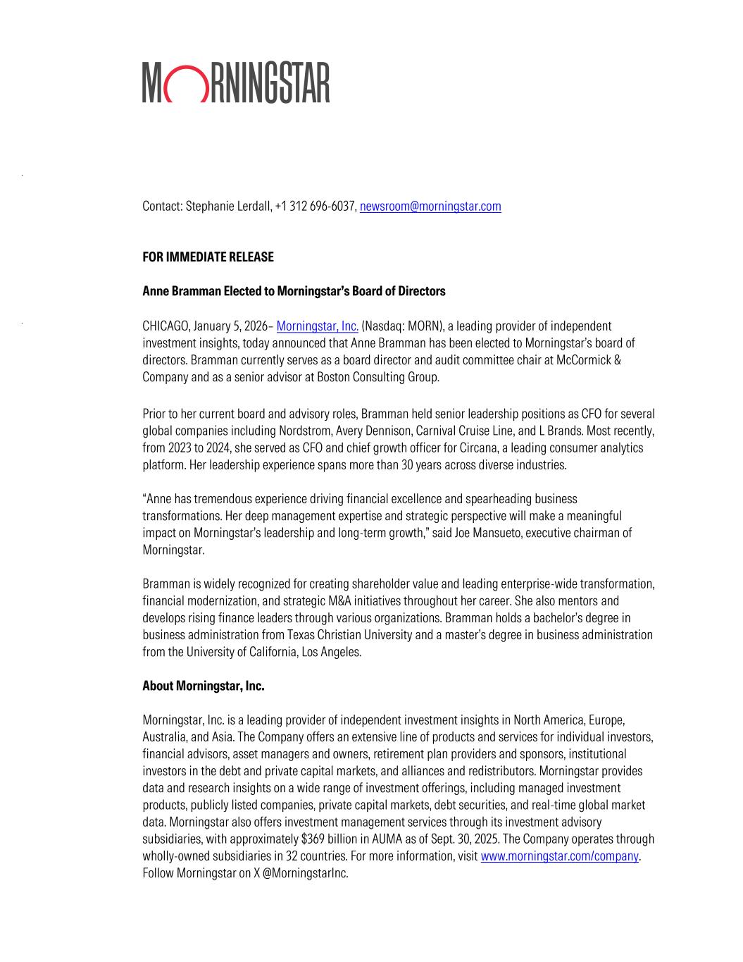 Contact: Stephanie Lerdall, +1 312 696-6037, newsroom@morningstar.com FOR IMMEDIATE RELEASE Anne Bramman Elected to Morningstar’s Board of Directors CHICAGO, January 5, 2026– Morningstar, Inc. (Nasdaq: MORN), a leading provider of independent investment insights, today announced that Anne Bramman has been elected to Morningstar’s board of directors. Bramman currently serves as a board director and audit committee chair at McCormick & Company and as a senior advisor at Boston Consulting Group. Prior to her current board and advisory roles, Bramman held senior leadership positions as CFO for several global companies including Nordstrom, Avery Dennison, Carnival Cruise Line, and L Brands. Most recently, from 2023 to 2024, she served as CFO and chief growth officer for Circana, a leading consumer analytics platform. Her leadership experience spans more than 30 years across diverse industries. “Anne has tremendous experience driving financial excellence and spearheading business transformations. Her deep management expertise and strategic perspective will make a meaningful impact on Morningstar’s leadership and long-term growth,” said Joe Mansueto, executive chairman of Morningstar. Bramman is widely recognized for creating shareholder value and leading enterprise-wide transformation, financial modernization, and strategic M&A initiatives throughout her career. She also mentors and develops rising finance leaders through various organizations. Bramman holds a bachelor’s degree in business administration from Texas Christian University and a master’s degree in business administration from the University of California, Los Angeles. About Morningstar, Inc. Morningstar, Inc. is a leading provider of independent investment insights in North America, Europe, Australia, and Asia. The Company offers an extensive line of products and services for individual investors, financial advisors, asset managers and owners, retirement plan providers and sponsors, institutional investors in the debt and private capital markets, and alliances and redistributors. Morningstar provides data and research insights on a wide range of investment offerings, including managed investment products, publicly listed companies, private capital markets, debt securities, and real-time global market data. Morningstar also offers investment management services through its investment advisory subsidiaries, with approximately $369 billion in AUMA as of Sept. 30, 2025. The Company operates through wholly-owned subsidiaries in 32 countries. For more information, visit www.morningstar.com/company. Follow Morningstar on X @MorningstarInc.