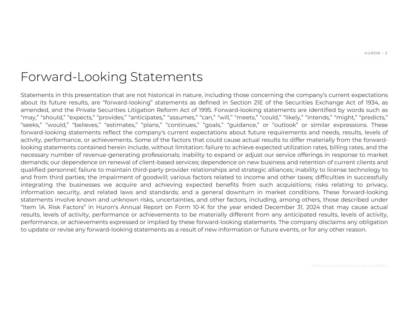 H U R O N I 2 © 2023 Huron Consulting Group Inc. and affiliates. Forward-Looking Statements Statements in this presentation that are not historical in nature, including those concerning the company’s current expectations about its future results, are “forward-looking” statements as defined in Section 21E of the Securities Exchange Act of 1934, as amended, and the Private Securities Litigation Reform Act of 1995. Forward-looking statements are identified by words such as “may,” “should,” “expects,” “provides,” “anticipates,” “assumes,” “can,” “will,” “meets,” “could,” “likely,” “intends,” “might,” “predicts,” “seeks,” “would,” “believes,” “estimates,” “plans,” “continues,” “goals,” “guidance,” or “outlook” or similar expressions. These forward-looking statements reflect the company's current expectations about future requirements and needs, results, levels of activity, performance, or achievements. Some of the factors that could cause actual results to differ materially from the forward- looking statements contained herein include, without limitation: failure to achieve expected utilization rates, billing rates, and the necessary number of revenue-generating professionals; inability to expand or adjust our service offerings in response to market demands; our dependence on renewal of client-based services; dependence on new business and retention of current clients and qualified personnel; failure to maintain third-party provider relationships and strategic alliances; inability to license technology to and from third parties; the impairment of goodwill; various factors related to income and other taxes; difficulties in successfully integrating the businesses we acquire and achieving expected benefits from such acquisitions; risks relating to privacy, information security, and related laws and standards; and a general downturn in market conditions. These forward-looking statements involve known and unknown risks, uncertainties, and other factors, including, among others, those described under “Item 1A. Risk Factors” in Huron's Annual Report on Form 10-K for the year ended December 31, 2024 that may cause actual results, levels of activity, performance or achievements to be materially different from any anticipated results, levels of activity, performance, or achievements expressed or implied by these forward-looking statements. The company disclaims any obligation to update or revise any forward-looking statements as a result of new information or future events, or for any other reason.