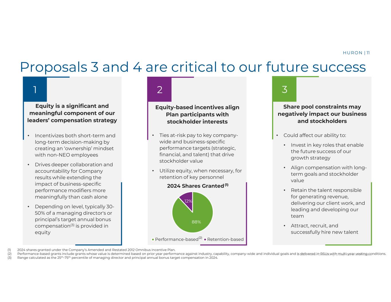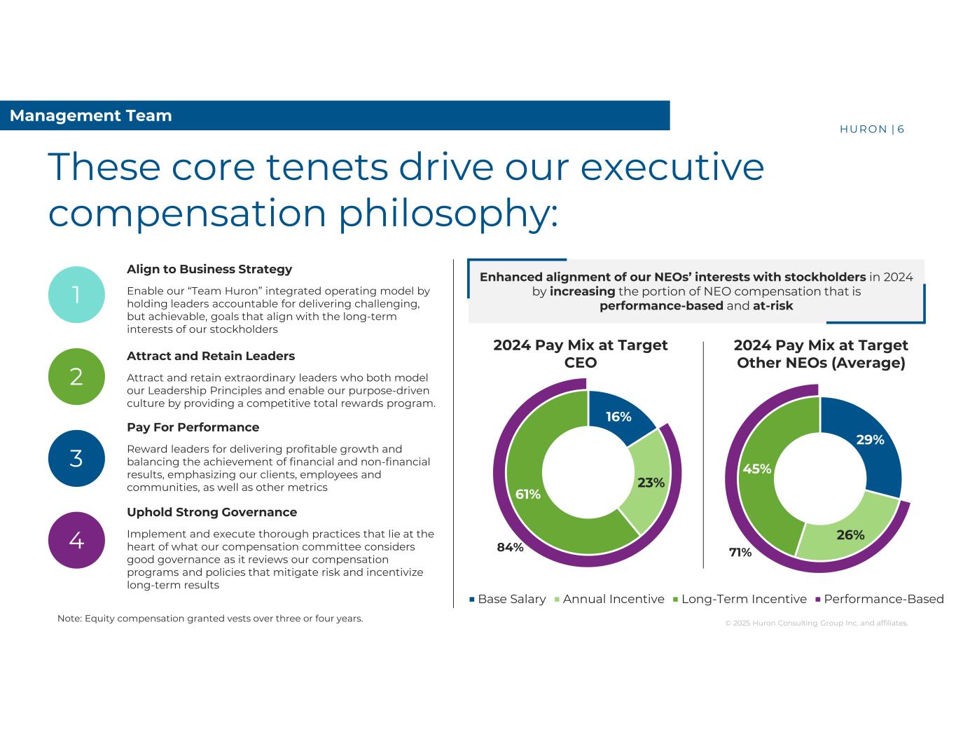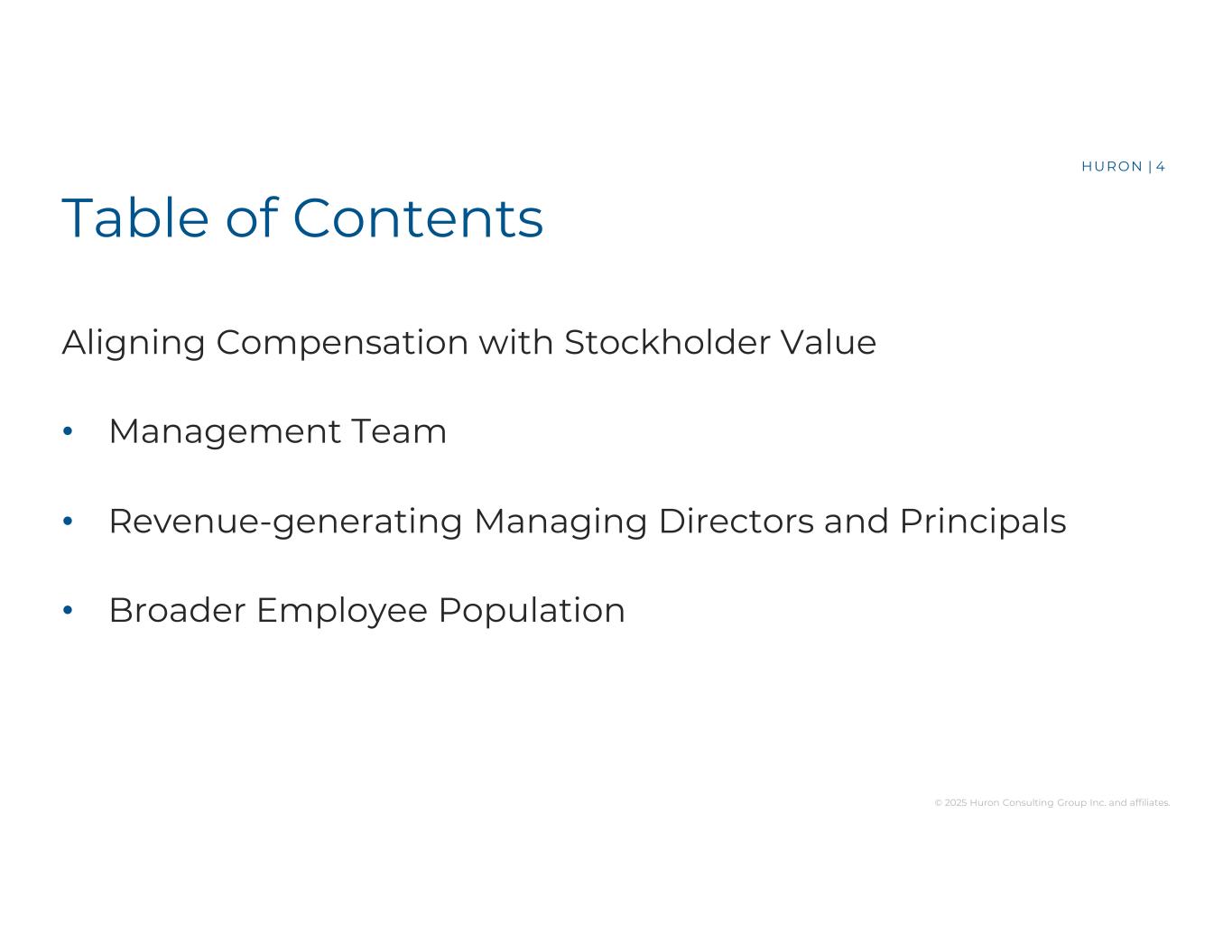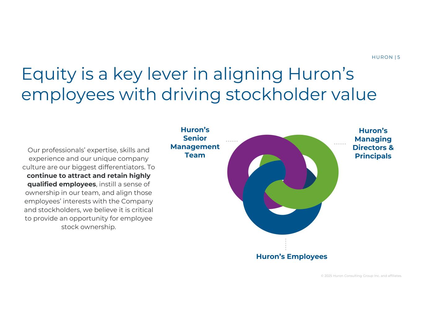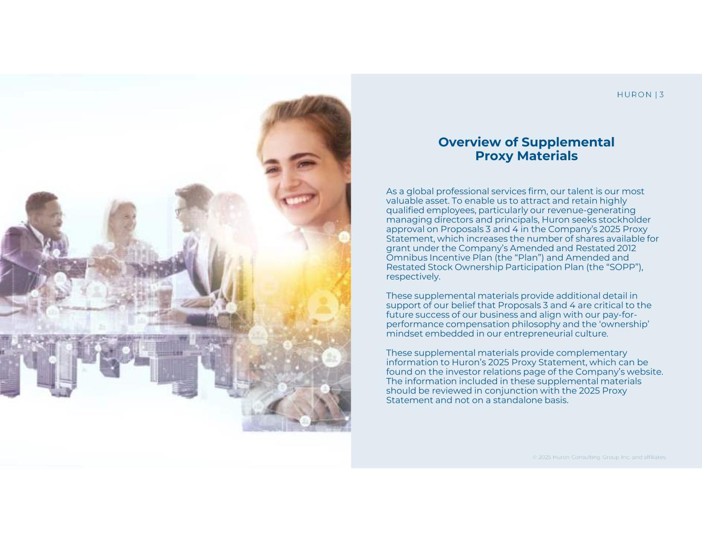 © 2025 Huron Consulting Group Inc. and affiliates. HURON | 3 Overview of Supplemental Proxy Materials As a global professional services firm, our talent is our most valuable asset. To enable us to attract and retain highly qualified employees, particularly our revenue-generating managing directors and principals, Huron seeks stockholder approval on Proposals 3 and 4 in the Company’s 2025 Proxy Statement, which increases the number of shares available for grant under the Company’s Amended and Restated 2012 Omnibus Incentive Plan (the “Plan”) and Amended and Restated Stock Ownership Participation Plan (the “SOPP”), respectively. These supplemental materials provide additional detail in support of our belief that Proposals 3 and 4 are critical to the future success of our business and align with our pay-for- performance compensation philosophy and the ‘ownership’ mindset embedded in our entrepreneurial culture. These supplemental materials provide complementary information to Huron’s 2025 Proxy Statement, which can be found on the investor relations page of the Company’s website. The information included in these supplemental materials should be reviewed in conjunction with the 2025 Proxy Statement and not on a standalone basis.