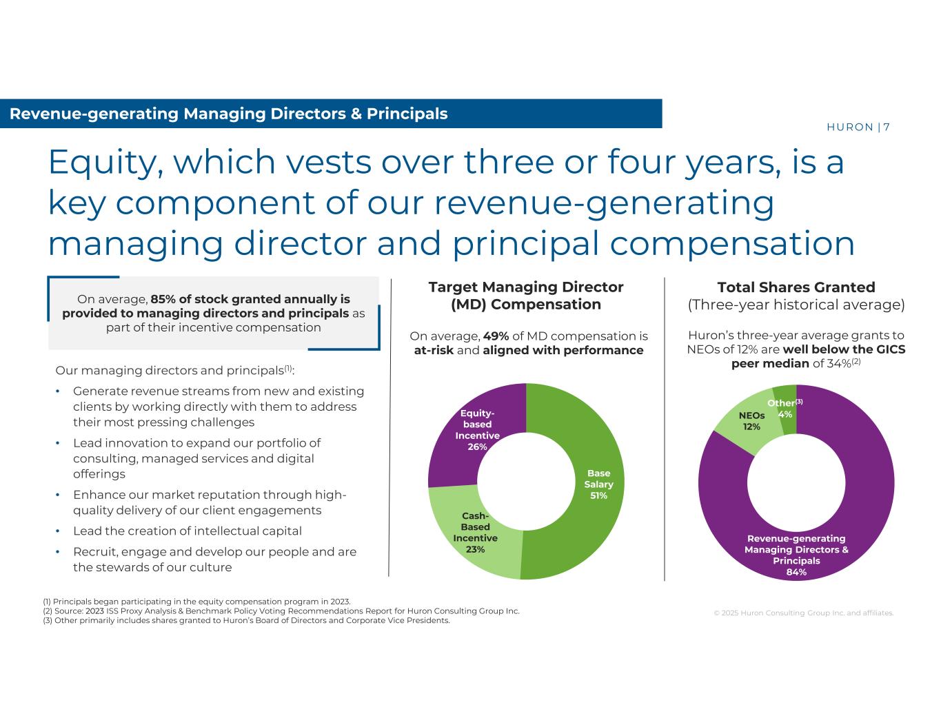 © 2025 Huron Consulting Group Inc. and affiliates. HURON | 6 16% 23% 61% Base Salary Annual Incentive Long-Term Incentive Performance-Based 29% 26% 45% 2024 Pay Mix at Target Other NEOs (Average) These core tenets drive our executive compensation philosophy: Management Team Align to Business Strategy Enable our “Team Huron” integrated operating model by holding leaders accountable for delivering challenging, but achievable, goals that align with the long-term interests of our stockholders Attract and Retain Leaders Attract and retain extraordinary leaders who both model our Leadership Principles and enable our purpose-driven culture by providing a competitive total rewards program. Pay For Performance Reward leaders for delivering profitable growth and balancing the achievement of financial and non-financial results, emphasizing our clients, employees and communities, as well as other metrics Uphold Strong Governance Implement and execute thorough practices that lie at the heart of what our compensation committee considers good governance as it reviews our compensation programs and policies that mitigate risk and incentivize long-term results 1 2 3 4 Enhanced alignment of our NEOs’ interests with stockholders in 2024 by increasing the portion of NEO compensation that is performance-based and at-risk 2024 Pay Mix at Target CEO Note: Equity compensation granted vests over three or four years. 84% 71%