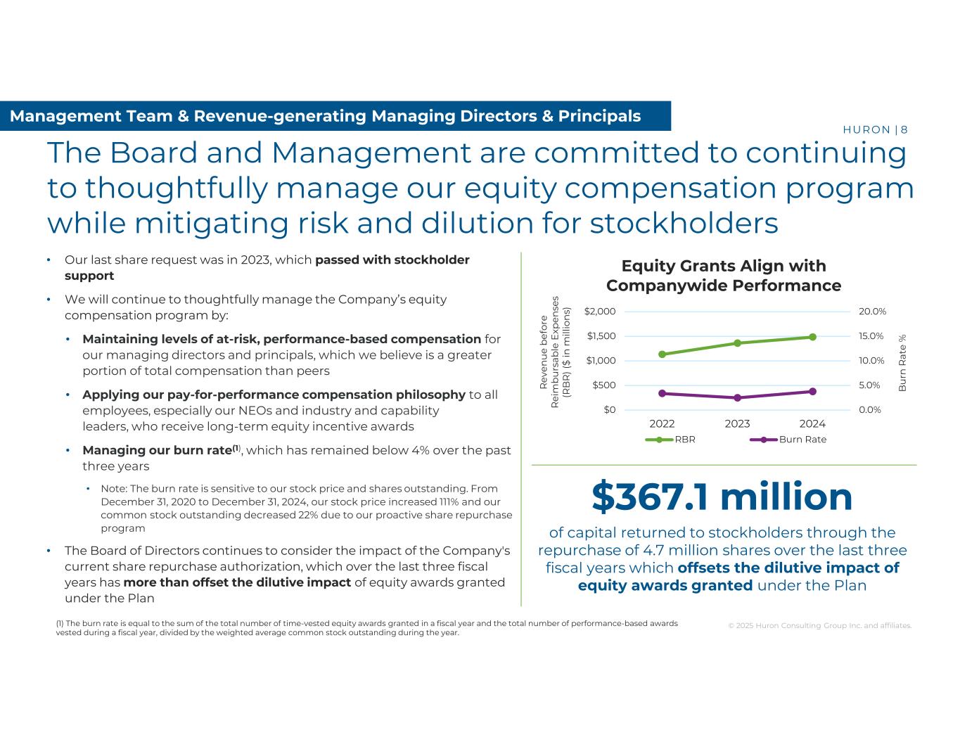 © 2025 Huron Consulting Group Inc. and affiliates. HURON | 7 Equity, which vests over three or four years, is a key component of our revenue-generating managing director and principal compensation program Revenue-generating Managing Directors & Principals Target Managing Director (MD) Compensation Base Salary 51% Cash- Based Incentive 23% Equity- based Incentive 26% Total Shares Granted (Three-year historical average) Revenue-generating Managing Directors & Principals 84% NEOs 12% Other(3) 4% (1) Principals began participating in the equity compensation program in 2023. (2) Source: 2023 ISS Proxy Analysis & Benchmark Policy Voting Recommendations Report for Huron Consulting Group Inc. (3) Other primarily includes shares granted to Huron’s Board of Directors and Corporate Vice Presidents. On average, 49% of MD compensation is at-risk and aligned with performance Huron’s three-year average grants to NEOs of 12% are well below the GICS peer median of 34%(2) Our managing directors and principals(1): • Generate revenue streams from new and existing clients by working directly with them to address their most pressing challenges • Lead innovation to expand our portfolio of consulting, managed services and digital offerings • Enhance our market reputation through high- quality delivery of our client engagements • Lead the creation of intellectual capital • Recruit, engage and develop our people and are the stewards of our culture On average, 85% of stock granted annually is provided to managing directors and principals as part of their incentive compensation