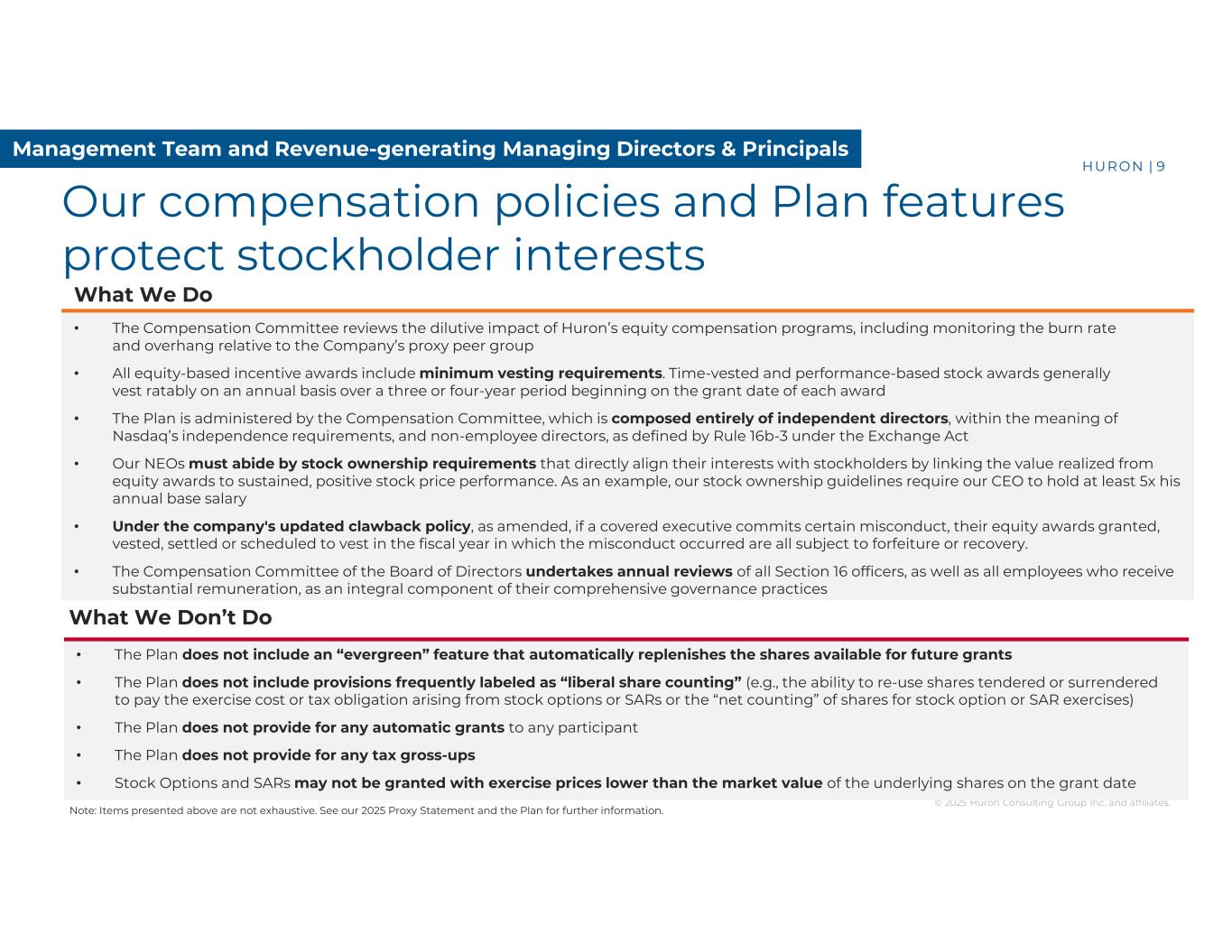© 2025 Huron Consulting Group Inc. and affiliates. HURON | 8 The Board and Management are committed to continuing to thoughtfully manage our equity compensation program while mitigating risk and dilution for stockholders • Our last share request was in 2023, which passed with stockholder support • We will continue to thoughtfully manage the Company’s equity compensation program by: • Maintaining levels of at-risk, performance-based compensation for our managing directors and principals, which we believe is a greater portion of total compensation than peers • Applying our pay-for-performance compensation philosophy to all employees, especially our NEOs and industry and capability leaders, who receive long-term equity incentive awards • Managing our burn rate(1), which has remained below 4% over the past three years • Note: The burn rate is sensitive to our stock price and shares outstanding. From December 31, 2020 to December 31, 2024, our stock price increased 111% and our common stock outstanding decreased 22% due to our proactive share repurchase program • The Board of Directors continues to consider the impact of the Company's current share repurchase authorization, which over the last three fiscal years has more than offset the dilutive impact of equity awards granted under the Plan 0.0% 5.0% 10.0% 15.0% 20.0% $0 $500 $1,000 $1,500 $2,000 2022 2023 2024 B u rn R a te % R e v e n u e b e fo re R e im b u rs a b le E x p e n se s (R B R ) ($ i n m il li o n s) Equity Grants Align with Companywide Performance RBR Burn Rate $367.1 million of capital returned to stockholders through the repurchase of 4.7 million shares over the last three fiscal years which offsets the dilutive impact of equity awards granted under the Plan (1) The burn rate is equal to the sum of the total number of time-vested equity awards granted in a fiscal year and the total number of performance-based awards vested during a fiscal year, divided by the weighted average common stock outstanding during the year. Management Team & Revenue-generating Managing Directors & Principals