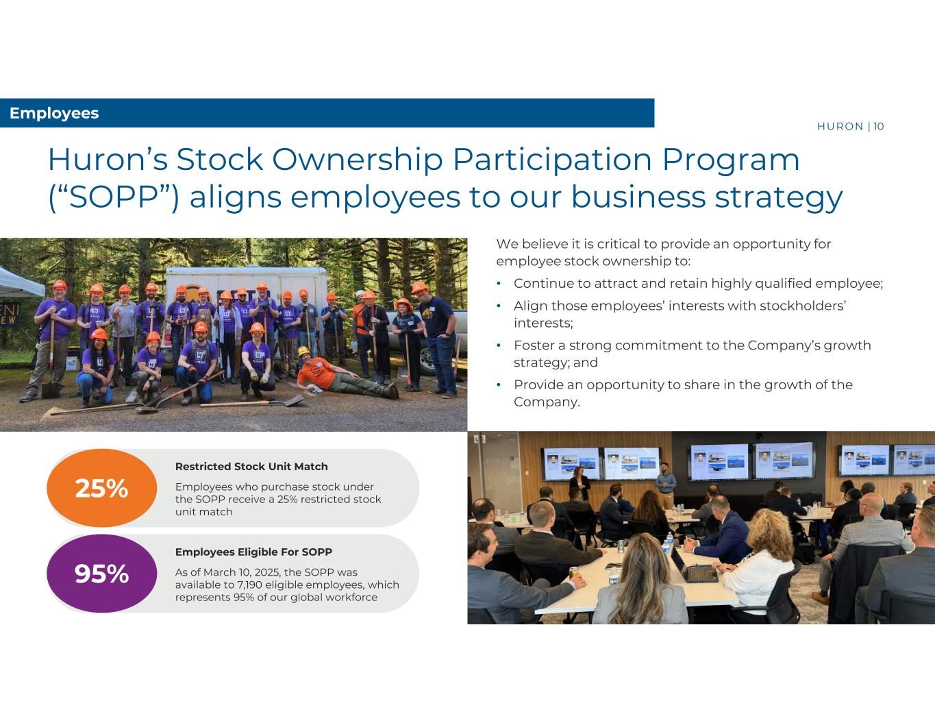 © 2025 Huron Consulting Group Inc. and affiliates. HURON | 9 Our compensation policies and Plan features protect stockholder interests • The Compensation Committee reviews the dilutive impact of Huron’s equity compensation programs, including monitoring the burn rate and overhang relative to the Company’s proxy peer group • All equity-based incentive awards include minimum vesting requirements. Time-vested and performance-based stock awards generally vest ratably on an annual basis over a three or four-year period beginning on the grant date of each award • The Plan is administered by the Compensation Committee, which is composed entirely of independent directors, within the meaning of Nasdaq’s independence requirements, and non-employee directors, as defined by Rule 16b-3 under the Exchange Act • Our NEOs must abide by stock ownership requirements that directly align their interests with stockholders by linking the value realized from equity awards to sustained, positive stock price performance. As an example, our stock ownership guidelines require our CEO to hold at least 5x his annual base salary • Under the company's updated clawback policy, as amended, if a covered executive commits certain misconduct, their equity awards granted, vested, settled or scheduled to vest in the fiscal year in which the misconduct occurred are all subject to forfeiture or recovery. • The Compensation Committee of the Board of Directors undertakes annual reviews of all Section 16 officers, as well as all employees who receive substantial remuneration, as an integral component of their comprehensive governance practices What We Do • The Plan does not include an “evergreen” feature that automatically replenishes the shares available for future grants • The Plan does not include provisions frequently labeled as “liberal share counting” (e.g., the ability to re-use shares tendered or surrendered to pay the exercise cost or tax obligation arising from stock options or SARs or the “net counting” of shares for stock option or SAR exercises) • The Plan does not provide for any automatic grants to any participant • The Plan does not provide for any tax gross-ups • Stock Options and SARs may not be granted with exercise prices lower than the market value of the underlying shares on the grant date Note: Items presented above are not exhaustive. See our 2025 Proxy Statement and the Plan for further information. Management Team and Revenue-generating Managing Directors & Principals What We Don’t Do