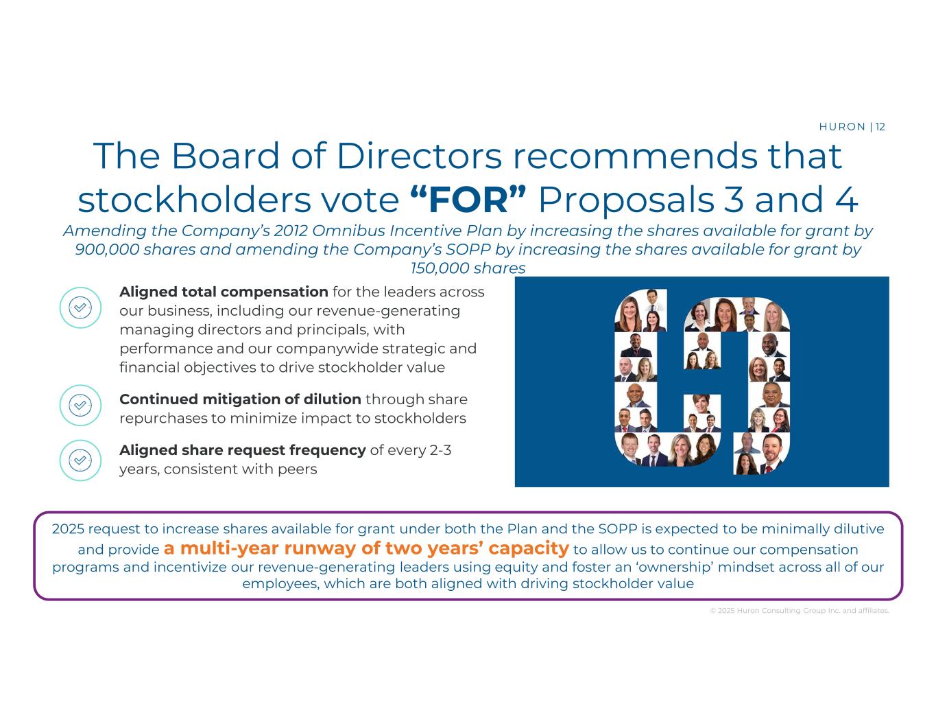 © 2025 Huron Consulting Group Inc. and affiliates. HURON | 11 Proposals 3 and 4 are critical to our future success 1 Equity is a significant and meaningful component of our leaders’ compensation strategy 2 Equity-based incentives align Plan participants with stockholder interests 3 Share pool constraints may negatively impact our business and stockholders 88% 12% 2024 Shares Granted Performance-based Retention-based (1) 2024 shares granted under the Company’s Amended and Restated 2012 Omnibus Incentive Plan. (2) Performance-based grants include grants whose value is determined based on prior year performance against industry, capability, company-wide and individual goals and is delivered in RSUs with multi-year vesting conditions. (3) Range calculated as the 25th-75th percentile of managing director and principal annual bonus target compensation in 2024. • Incentivizes both short-term and long-term decision-making by creating an ‘ownership’ mindset with non-NEO employees • Drives deeper collaboration and accountability for Company results while extending the impact of business-specific performance modifiers more meaningfully than cash alone • Depending on level, typically 30- 50% of a managing director's or principal’s target annual bonus compensation(3) is provided in equity • Ties at-risk pay to key company- wide and business-specific performance targets (strategic, financial, and talent) that drive stockholder value • Utilize equity, when necessary, for retention of key personnel • Could affect our ability to: • Invest in key roles that enable the future success of our growth strategy • Align compensation with long- term goals and stockholder value • Retain the talent responsible for generating revenue, delivering our client work, and leading and developing our team • Attract, recruit, and successfully hire new talent (1) (2)