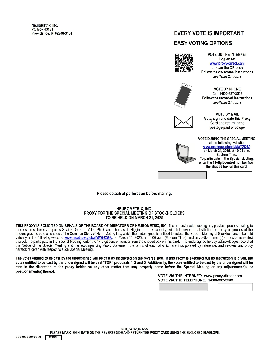 We cordially invite you to attend a special meeting (the “Special Meeting”) of stockholders of NeuroMetrix, Inc. (the “Company” or “we”), to be held on March 21, 2025 at 10:00 a.m., Eastern Time (unless the Special Meeting is adjourned or postponed), via the Internet.