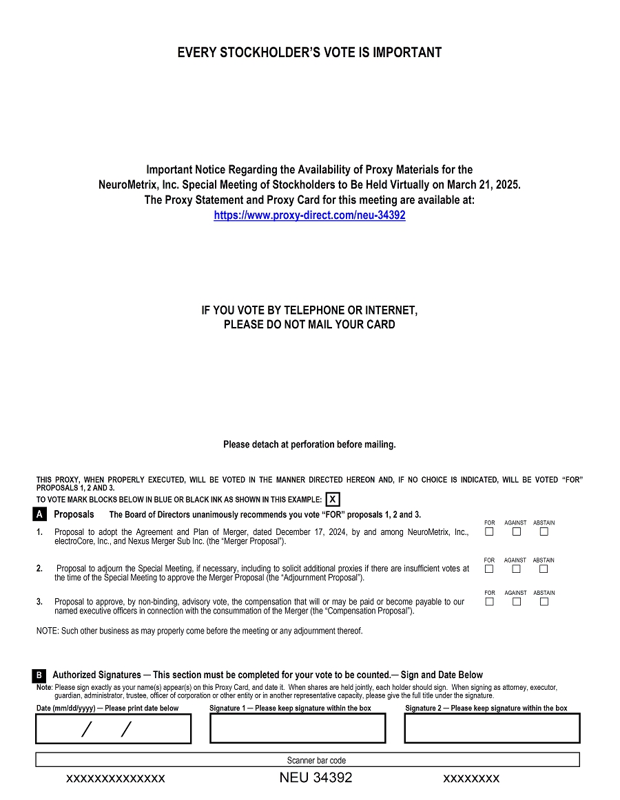 Reference is hereby made to that certain Agreement and Plan of Merger, dated as of December [●], 2024 (as amended, the “Merger Agreement”), by and among electroCore, Inc., a Delaware corporation (“Parent”), Nexus Merger Sub Inc., a Delaware corporation and wholly owned subsidiary of Parent (“Merger Sub”), and NeuroMetrix, Inc., a Delaware corporation (the “Company”). Capitalized terms used herein but not otherwise defined shall have the meanings assigned in the Merger Agreement.