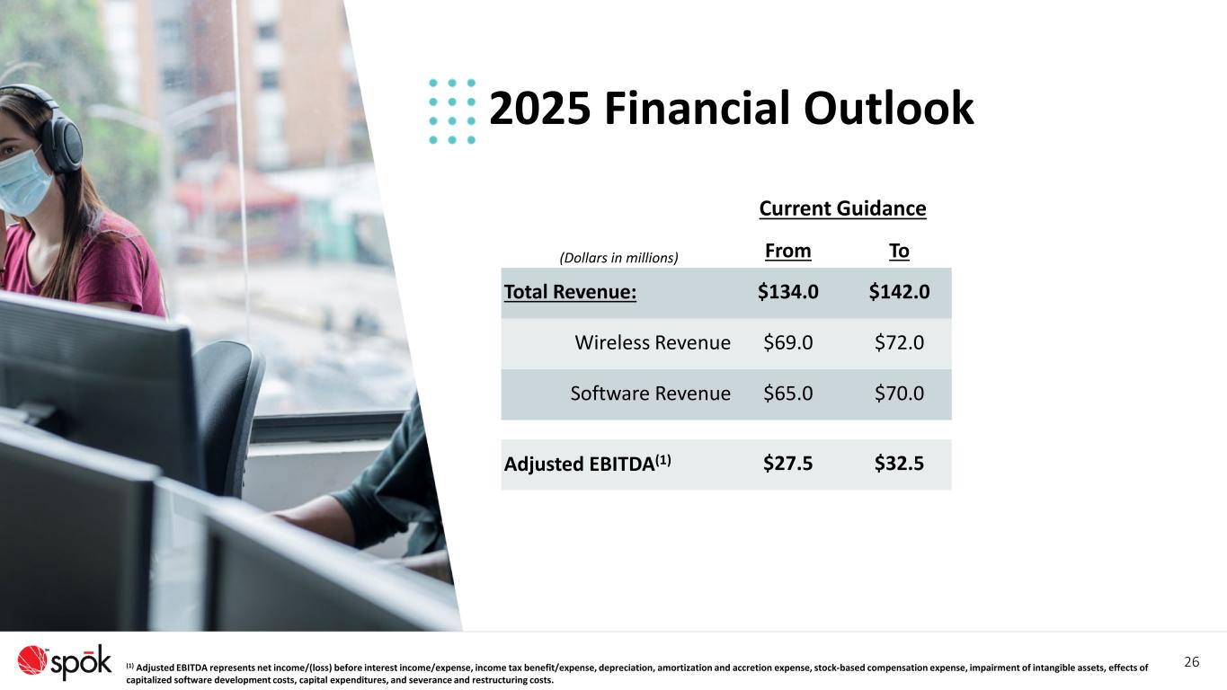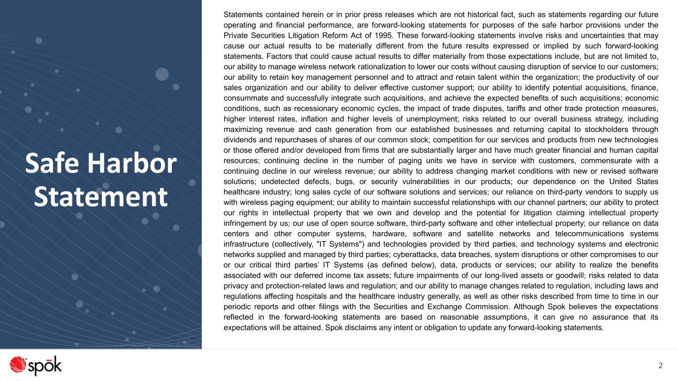 2 Safe Harbor Statement Statements contained herein or in prior press releases which are not historical fact, such as statements regarding our future operating and financial performance, are forward-looking statements for purposes of the safe harbor provisions under the Private Securities Litigation Reform Act of 1995. These forward-looking statements involve risks and uncertainties that may cause our actual results to be materially different from the future results expressed or implied by such forward-looking statements. Factors that could cause actual results to differ materially from those expectations include, but are not limited to, our ability to manage wireless network rationalization to lower our costs without causing disruption of service to our customers; our ability to retain key management personnel and to attract and retain talent within the organization; the productivity of our sales organization and our ability to deliver effective customer support; our ability to identify potential acquisitions, finance, consummate and successfully integrate such acquisitions, and achieve the expected benefits of such acquisitions; economic conditions, such as recessionary economic cycles, the impact of trade disputes, tariffs and other trade protection measures, higher interest rates, inflation and higher levels of unemployment; risks related to our overall business strategy, including maximizing revenue and cash generation from our established businesses and returning capital to stockholders through dividends and repurchases of shares of our common stock; competition for our services and products from new technologies or those offered and/or developed from firms that are substantially larger and have much greater financial and human capital resources; continuing decline in the number of paging units we have in service with customers, commensurate with a continuing decline in our wireless revenue; our ability to address changing market conditions with new or revised software solutions; undetected defects, bugs, or security vulnerabilities in our products; our dependence on the United States healthcare industry; long sales cycle of our software solutions and services; our reliance on third-party vendors to supply us with wireless paging equipment; our ability to maintain successful relationships with our channel partners; our ability to protect our rights in intellectual property that we own and develop and the potential for litigation claiming intellectual property infringement by us; our use of open source software, third-party software and other intellectual property; our reliance on data centers and other computer systems, hardware, software and satellite networks and telecommunications systems infrastructure (collectively, "IT Systems") and technologies provided by third parties, and technology systems and electronic networks supplied and managed by third parties; cyberattacks, data breaches, system disruptions or other compromises to our or our critical third parties’ IT Systems (as defined below), data, products or services; our ability to realize the benefits associated with our deferred income tax assets; future impairments of our long-lived assets or goodwill; risks related to data privacy and protection-related laws and regulation; and our ability to manage changes related to regulation, including laws and regulations affecting hospitals and the healthcare industry generally, as well as other risks described from time to time in our periodic reports and other filings with the Securities and Exchange Commission. Although Spok believes the expectations reflected in the forward-looking statements are based on reasonable assumptions, it can give no assurance that its expectations will be attained. Spok disclaims any intent or obligation to update any forward-looking statements.