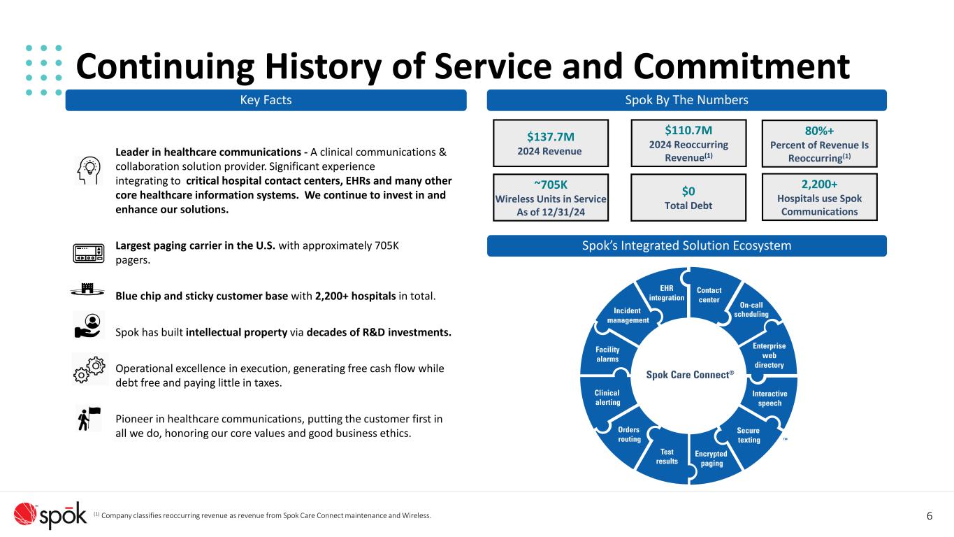 Key Investment Highlights Significant Annual Free Cash Flow Generation and Strong Balance Sheet Substantial cash flow being returned to shareholders through considerable quarterly dividend, no debt Software Operations Bookings Momentum, Large Identified Pipeline Expanding software pipeline converting to growth in sales Stable Re-occurring Software Maintenance and Wireless Segment Revenue 80+% of Spok’s revenue is re-occurring in nature due to maintenance revenue from contact center and wireless paging revenue Long-standing Customer Relationships with the “Best Hospitals” Nine of the Top 10 U.S. News & World Report’s Children’s Hospitals and 18 of the Top 20 Adult Hospitals are Spok customers, with an average tenure of 26 years 5 2 3 1 Clear Roadmap Developed to Execute Strategy Multiple avenues of organic and inorganic growth across new and existing customers and product development 4 4