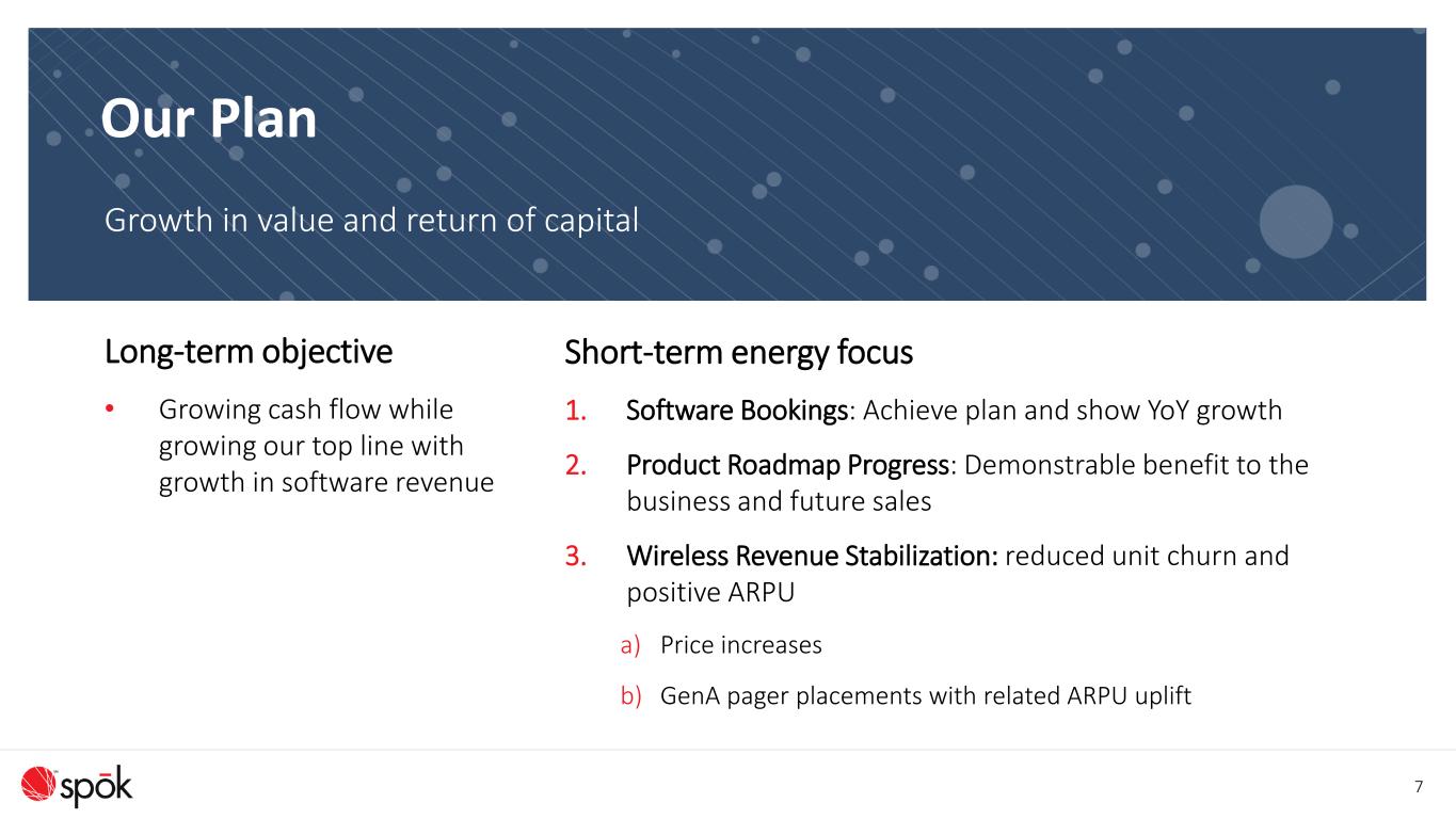 6 Continuing History of Service and Commitment Leader in healthcare communications - A clinical communications & collaboration solution provider. Significant experience integrating to critical hospital contact centers, EHRs and many other core healthcare information systems. We continue to invest in and enhance our solutions. Largest paging carrier in the U.S. with approximately 705K pagers. Blue chip and sticky customer base with 2,200+ hospitals in total. Spok has built intellectual property via decades of R&D investments. Operational excellence in execution, generating free cash flow while debt free and paying little in taxes. Pioneer in healthcare communications, putting the customer first in all we do, honoring our core values and good business ethics. $137.7M 2024 Revenue $110.7M 2024 Reoccurring Revenue(1) $0 Total Debt 80%+ Percent of Revenue Is Reoccurring(1) 2,200+ Hospitals use Spok Communications ~705K Wireless Units in Service As of 12/31/24 Key Facts Spok By The Numbers Spok’s Integrated Solution Ecosystem (1) Company classifies reoccurring revenue as revenue from Spok Care Connect maintenance and Wireless.