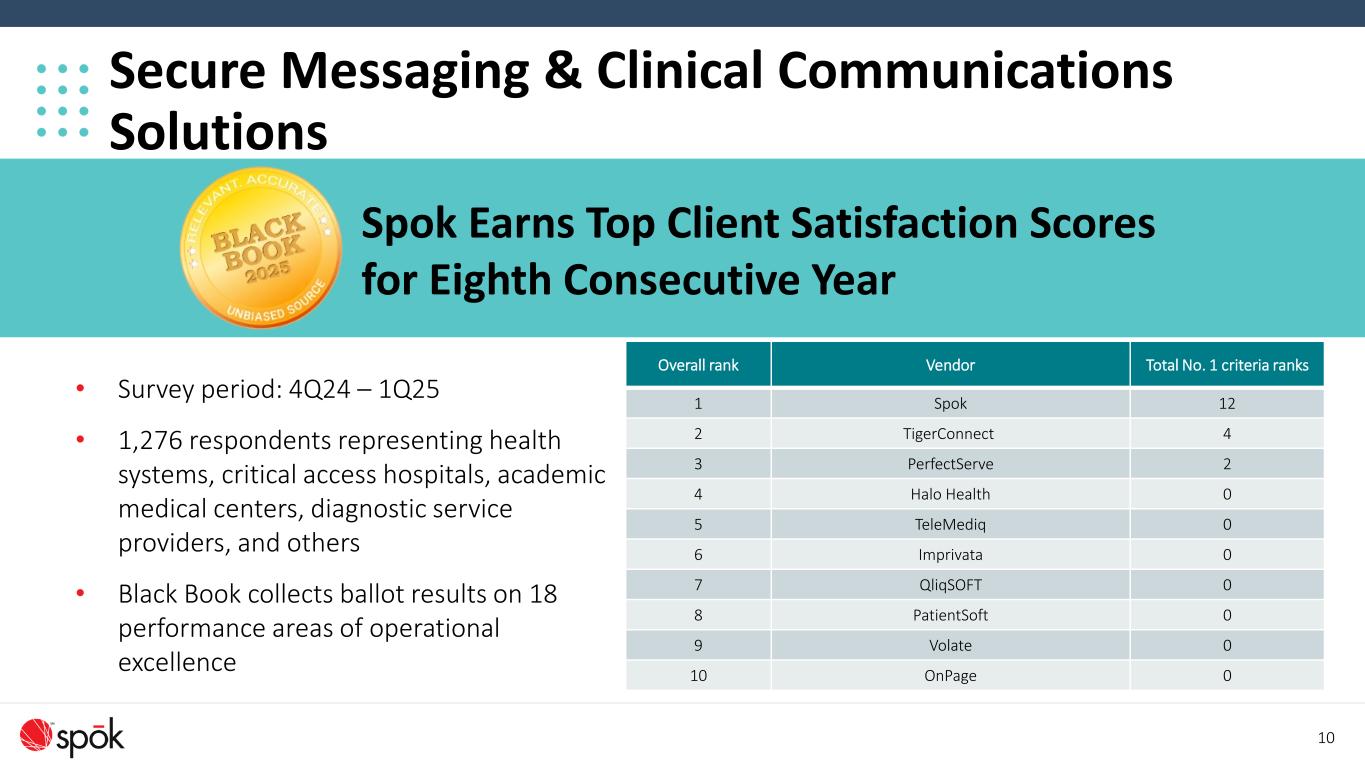 10 Secure Messaging & Clinical Communications Solutions • Survey period: 4Q24 – 1Q25 • 1,276 respondents representing health systems, critical access hospitals, academic medical centers, diagnostic service providers, and others • Black Book collects ballot results on 18 performance areas of operational excellence Spok Earns Top Client Satisfaction Scores for Eighth Consecutive Year Overall rank Vendor Total No. 1 criteria ranks 1 Spok 12 2 TigerConnect 4 3 PerfectServe 2 4 Halo Health 0 5 TeleMediq 0 6 Imprivata 0 7 QliqSOFT 0 8 PatientSoft 0 9 Volate 0 10 OnPage 0