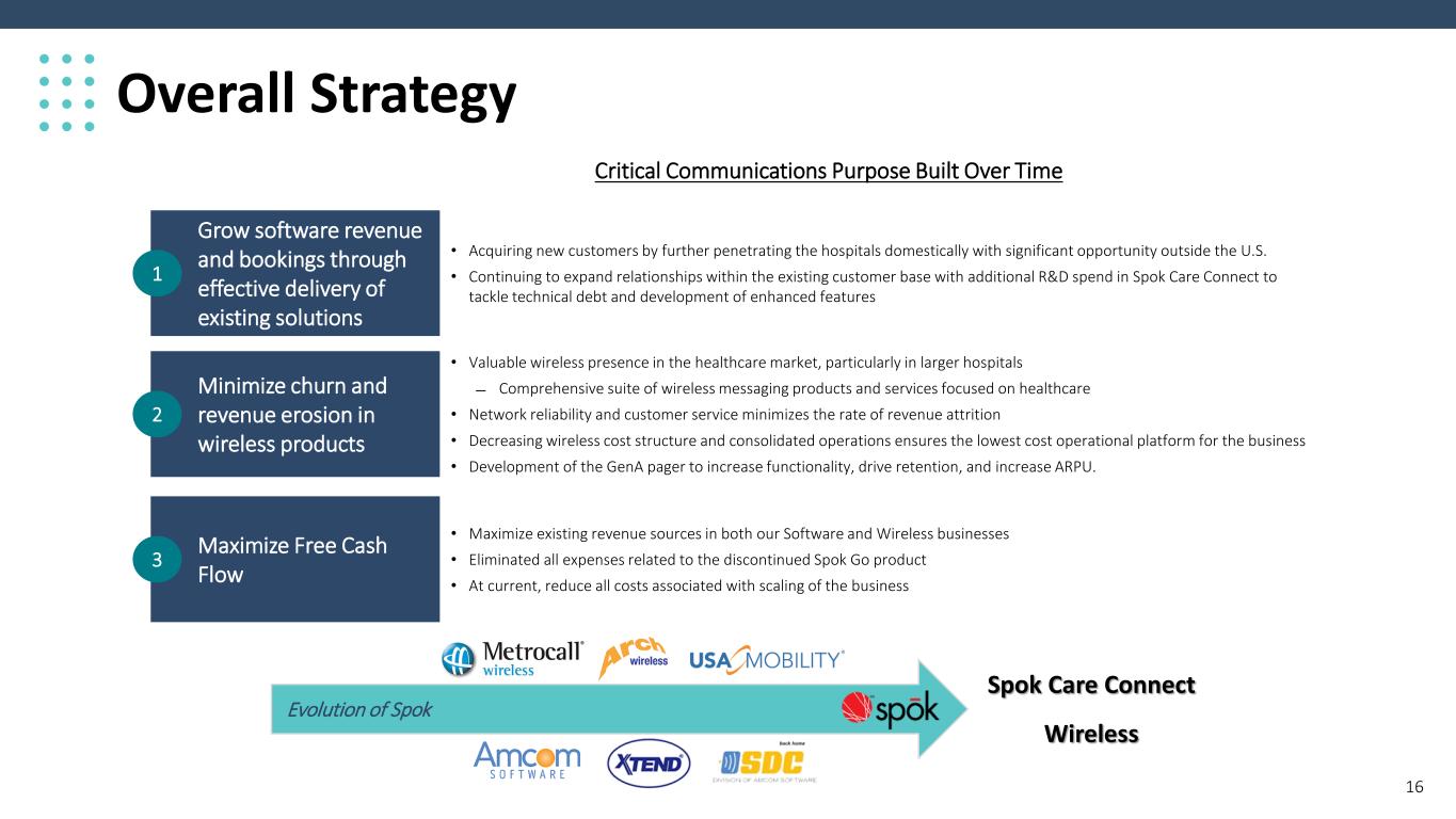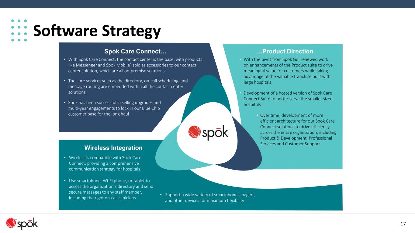 Overall Strategy Critical Communications Purpose Built Over Time Evolution of Spok • Acquiring new customers by further penetrating the hospitals domestically with significant opportunity outside the U.S. • Continuing to expand relationships within the existing customer base with additional R&D spend in Spok Care Connect to tackle technical debt and development of enhanced features Grow software revenue and bookings through effective delivery of existing solutions 1 Maximize Free Cash Flow 3 Minimize churn and revenue erosion in wireless products 2 • Maximize existing revenue sources in both our Software and Wireless businesses • Eliminated all expenses related to the discontinued Spok Go product • At current, reduce all costs associated with scaling of the business • Valuable wireless presence in the healthcare market, particularly in larger hospitals ̶ Comprehensive suite of wireless messaging products and services focused on healthcare • Network reliability and customer service minimizes the rate of revenue attrition • Decreasing wireless cost structure and consolidated operations ensures the lowest cost operational platform for the business • Development of the GenA pager to increase functionality, drive retention, and increase ARPU. Wireless Spok Care Connect 16