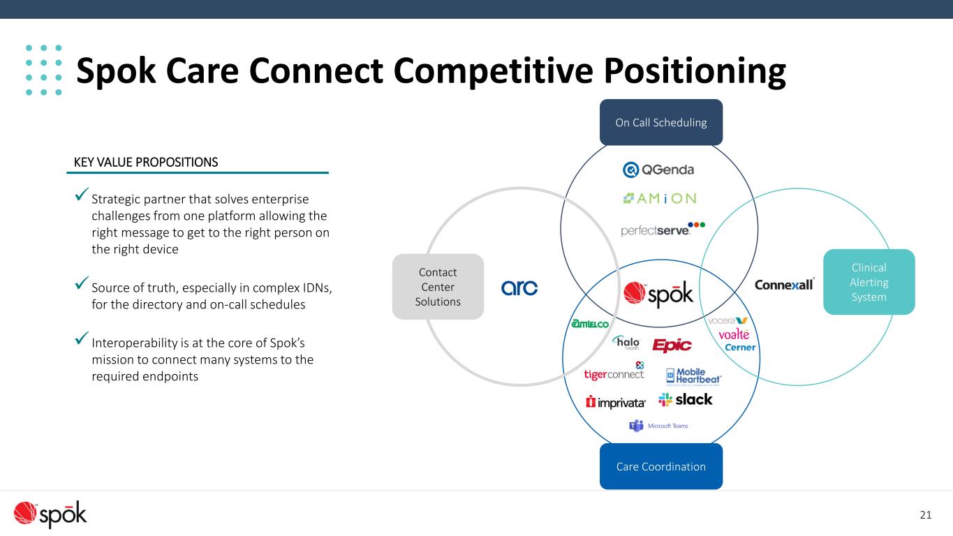 Spok Care Connect Competitive Positioning KEY VALUE PROPOSITIONS Strategic partner that solves enterprise challenges from one platform allowing the right message to get to the right person on the right device Source of truth, especially in complex IDNs, for the directory and on-call schedules Interoperability is at the core of Spok’s mission to connect many systems to the required endpoints On Call Scheduling Clinical Alerting System Care Coordination Contact Center Solutions 21