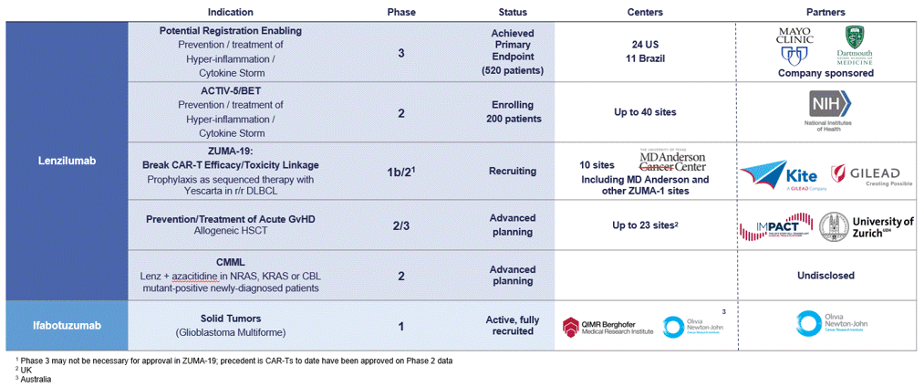 Our lenzilumab pipeline comprises a completed Phase 3 registration trial in COVID-19 with positive topline results, the NIH-sponsored and funded ACTIV-5/BET program in COVID-19, a currently enrolling Phase 1b/2 study (ZUMA-19) as sequenced therapy of lenzilumab and Yescarta, a planned Phase 2/3 study in acute GvHD, and a planned Phase 2 study in chronic myelomonocytic leukemia (CMML), the latter two of which we expect will be majority funded by partners.