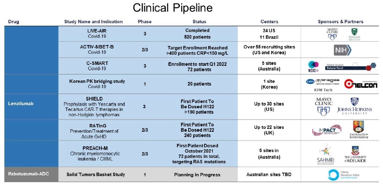 On July 24, 2020, the Company entered into a clinical trial agreement (the “ACTIV-5 Clinical Trial Agreement”) with the National Institute of Allergy and Infectious Diseases (“NIAID”), part of NIH, which is part of the U.S. Government Department of Health and Human Services, as represented by the Division of Microbiology and Infectious Diseases. Pursuant to the ACTIV-5 Clinical Trial Agreement, lenzilumab is being evaluated in the NIAID-sponsored ACTIV-5/BET-B in hospitalized patients with COVID-19. The ACTIV-5/BET-B study protocol was modified to include baseline CRP below 150 mg/L (the CRP subgroup) as the primary analysis population. The ACTIV-5/BET-B study has reached its target enrollment with over 400 patients enrolled that met this criterion and the Company anticipates top-line data in late first quarter or early second quarter of 2022. See Note 1 above for further information regarding ACTIV-5/BET-B.