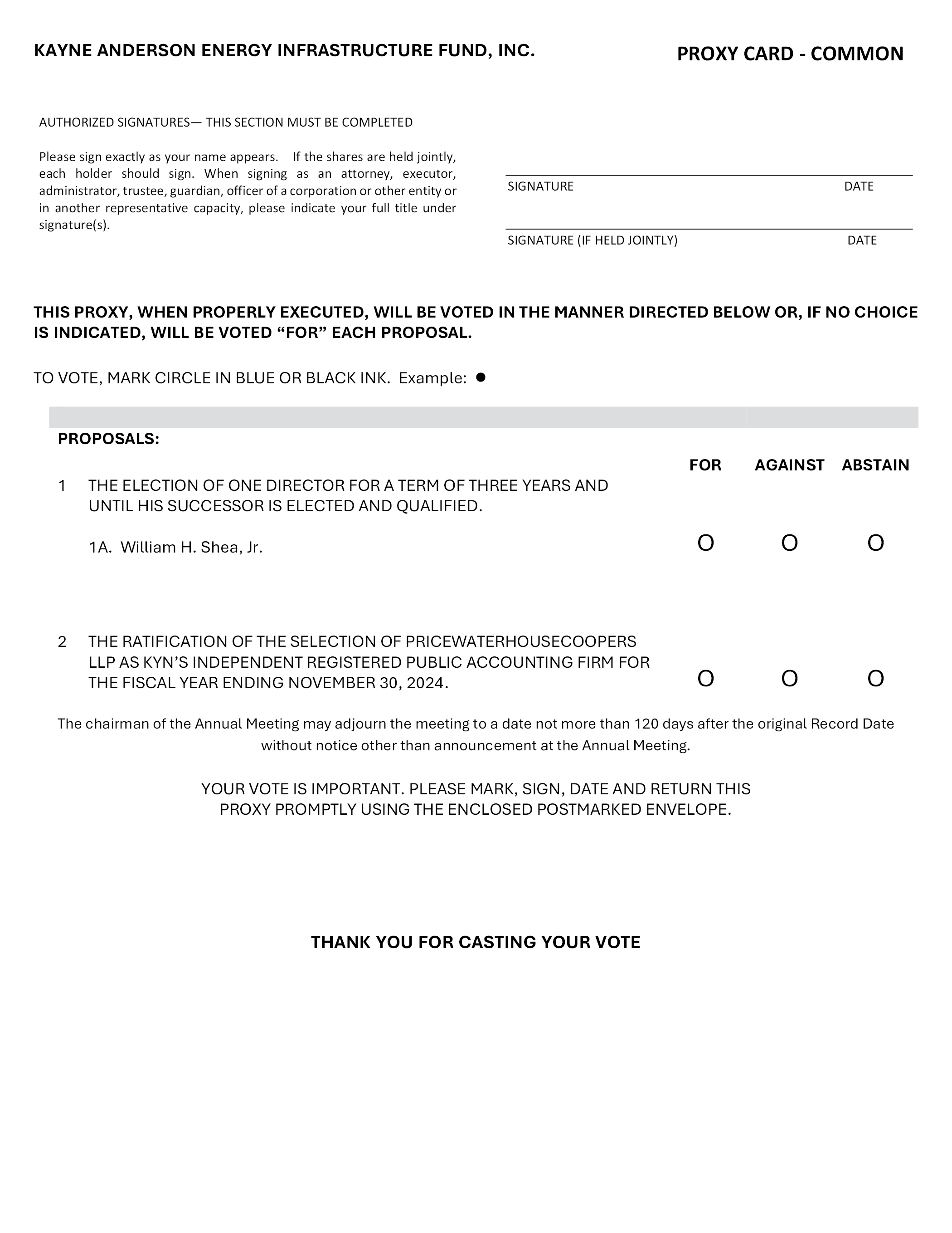 PROXY CARD – COMMON KAYNE ANDERSON ENERGY INFRASTRUCTURE FUND, INC. AUTHORIZED SIGNATURES— THIS SECTION MUST BE COMPLETED Please sign exactly as your name appears. If the shares are held jointly, each holder should sign. When signing as an attorney, executor, administrator, trustee, guardian, officer of a corporation or other entity or in another representative capacity, please indicate your full title under signature(s). SIGNATURE DATE SIGNATURE DATE THIS PROXY, WHEN PROPERLY EXECUTED, WILL BE VOTED IN THE MANNER DIRECTED BELOW OR, IF NO CHOICE IS INDICATED, WILL BE VOTED “FOR” EACH PROPOSAL. TO VOTE, MARK CIRCLE IN BLUE OR BLACK INK. Example: PROPOSALS: FOR AGAINST ABSTAIN 1 THE ELECTION OF ONE DIRECTOR FOR A TERM OF THREE YEARS AND UNTIL HIS SUCCESSOR IS ELECTED AND QUALIFIED. 1A. William H. Shea, Jr. 2 THE RATIFICATION OF THE SELECTION OF PRICEWATERHOUSECOOPERS LLP AS KYN’S INDEPENDENT REGISTERED PUBLIC ACCOUNTING FIRM FOR THE FISCAL YEAR ENDING NOVEMBER 30, 2024. The chairman of the Annual Meeting may adjourn the meeting to a date not more than 120 days after the original Record Date without notice other than announcement at the Annual Meeting. YOUR VOTE IS IMPORTANT. PLEASE MARK, SIGN, DATE AND RETURN THIS PROXY PROMPTLY USING THE ENCLOSED POSTMARKED ENVELOPE. THANK YOU FOR CASTING YOUR VOTE