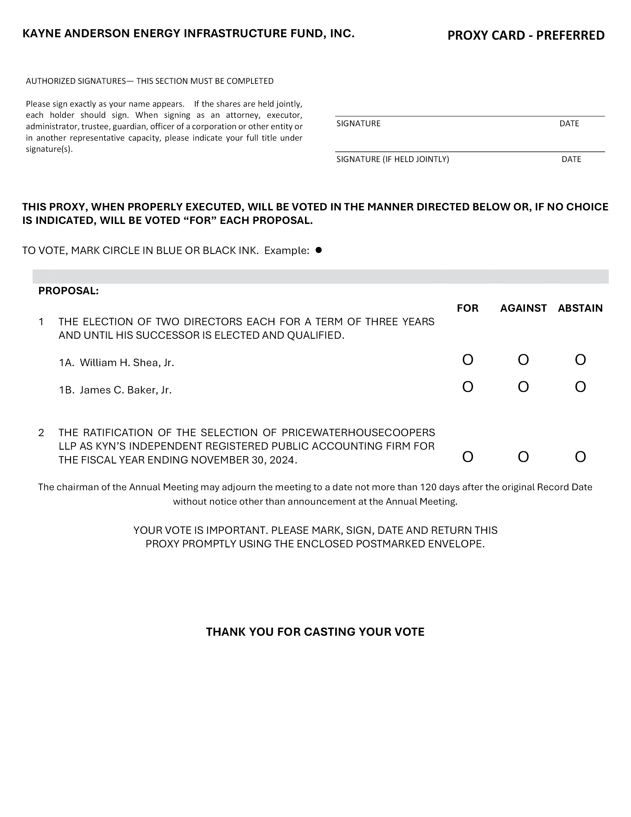 PROXY CARD – PREFERRED KAYNE ANDERSON ENERGY INFRASTRUCTURE FUND, INC. AUTHORIZED SIGNATURES— THIS SECTION MUST BE COMPLETED Please sign exactly as your name appears. If the shares are held jointly, each holder should sign. When signing as an attorney, executor, administrator, trustee, guardian, officer of a corporation or other entity or in another representative capacity, please indicate your full title under signature(s). SIGNATURE DATE SIGNATURE (IF HELD JOINTLY) DATE THIS PROXY, WHEN PROPERLY EXECUTED, WILL BE VOTED IN THE MANNER DIRECTED BELOW OR, IF NO CHOICE IS INDICATED, WILL BE VOTED “FOR” EACH PROPOSAL. TO VOTE, MARK CIRCLE IN BLUE OR BLACK INK. Example: PROPOSAL: FOR AGAINST ABSTAIN 1 THE ELECTION OF TWO DIRECTORS EACH FOR A TERM OF THREE YEARS AND UNTIL HIS SUCCESSOR IS ELECTED AND QUALIFIED. 1A. William H. Shea, Jr. 1B. James C. Baker, Jr. 2 THE RATIFICATION OF THE SELECTION OF PRICEWATERHOUSECOOPERS LLP AS KYN’S INDEPENDENT REGISTERED PUBLIC ACCOUNTING FIRM FOR THE FISCAL YEAR ENDING NOVEMBER 30, 2024. The chairman of the Annual Meeting may adjourn the meeting to a date not more than 120 days after the original Record Date without notice other than announcement at the Annual Meeting. YOUR VOTE IS IMPORTANT. PLEASE MARK, SIGN, DATE AND RETURN THIS PROXY PROMPTLY USING THE ENCLOSED POSTMARKED ENVELOPE. THANK YOU FOR CASTING YOUR VOTE