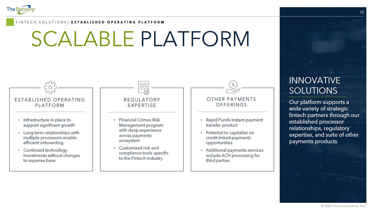 11 FINTECH SOLUTIONS: FEE & DEPOSIT GENERATING ACTIVITIES ENABLING LEADING FINTECH COMPANIES DEBIT PROGRAM MANAGERS (CHALLENGER BANKS) PREPAID/STORED VALUE PROGRAM MANAGERS • Provides physical and virtual card issuing • Maintains deposit balances on cards • Facilitates payments into the card networks as the sponsoring bank • Established risk and compliance function is highly scalable #6 Debit Issuing Bank 2024 2 #1 Prepaid Issuing Bank 2024 2 • Government • Employer Benefits • Corporate Disbursements • Payroll • Gift 1 Please see Appendix slide 31 for calculation of Fintech as a % of Total Bank Revenue. 2 Nilson Report, April 2025. % TOTAL BANK REVENUE Q3 YTD 2025 1 26 % GROSS DOLLAR VOLUME GROWTH Q3 2025 VS Q3 2024 16 %