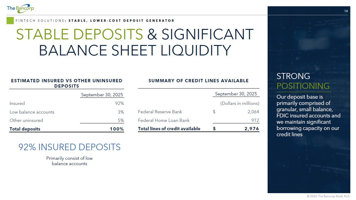 13 FINTECH SOLUTIONS : STABLE, LOWER - COST DEPOSIT GENERATOR DEPOSIT GROWTH FROM FINTECH BUSINESS HIGHLIGHTS • Stable deposit base anchored by contractual, multi - year relationships in our Fintech Solutions business • Fintech Solutions growth driven by increased transactional volume due to electronic banking migration and the addition of new partners $0.0 $1.0 $2.0 $3.0 $4.0 $5.0 $6.0 $7.0 $8.0 $9.0 2021 2022 2023 2024 Q3 2025 AVERAGE DEPOSITS BY PERIOD ($ BILLIONS) Fintech Solutions Group (Prepaid and Debit Card Issuance and other payments) Other (Includes time deposits and other legacy deposit programs) 2.04% 2.37% 2.32% 0.82% 0.10% COST OF DEPOSITS $5.7 $6.3 $6.4 $6.9 $7.6