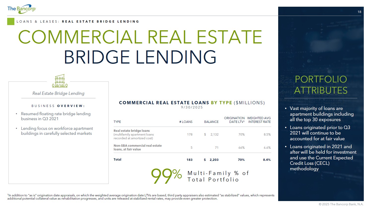 17 LOANS & LEASES LOAN PORTFOLIO OVERVIEW % OF TOTAL PORTFOLIO 9/30/2025 PRINCIPAL BALANCE ($ MILLIONS) BALANCE SHEET CATEGORY BUSINESS LINE 31% $ 2,132 Multifamily apartment loans recorded at amortized cost (A) Real Estate Bridge Lending 1% 71 Non - SBA commercial real estate loans, at fair value 32% 2,203 Total 17% 1,137 Securities - backed lines of credit (SBLOC) ( B) Institutional Banking 7% 472 Insurance - backed lines of credit (IBLOC) (C) 4% 286 Advisor Financing 28% 1,895 Total 6% 407 U.S. government guaranteed portion of SBA loans ( D) Small Business Lending 6% 378 Commercial mortgage SBA ( E) 2% 121 Non - guaranteed portion of U.S. govn’t guaranteed 7(a) loans 2% 128 Non - SBA small business loans <1% 21 Construction SBA <1% 4 Other 16% 1,059 Total 10% 693 Leasing ( F) Commercial Fleet Leasing 12% 785 Consumer fintech ( G) Fintech Solutions Group 2% 164 Other Other 100% $ 6,799 Total principal LOAN COLLATERAL VALUES SUPPORTED BY: A. Comprised of workforce apartment buildings in carefully selected areas B. SBLOC loans are backed by marketable securities with nominal credit losses C. IBLOC loans are backed by the cash value of life insurance policies with nominal credit losses D. Portion of small business loans fully guaranteed by the U.S. government E. 50% - 60% loan to value ratios at origination F. Recourse to vehicles G. Consists of secured credit cards & other short - term extensions of credit