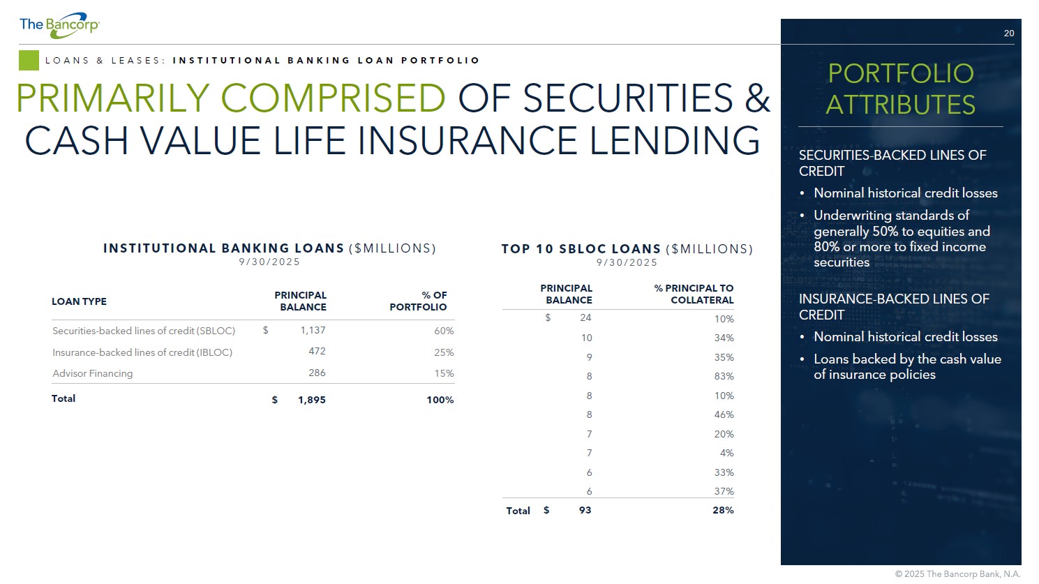 19 LOANS & LEASES: INSTITUTIONAL BANKING INSTITUTIONAL BANKING BUSINESS OVERVIEW: • Automated loan application platform, Talea, provides industry - leading speed and delivery • Securities - backed lines of credit provide fast and flexible liquidity for investment portfolios • Insurance - backed lines of credit provide fast and flexible borrowing against the cash value of life insurance • Advisor Finance product provides capital to transitioning financial advisors to facilitate M&A, debt restructuring, and the development of succession plans • Deposit accounts for wealth management clients • Nominal historical credit losses STRATEGIC OUTLOOK: • Continue to focus on SBLOC and manage IBLOC and Advisor Finance balances • Market dynamics support business model: − Advisors shifting from large broker/dealers to independent platforms − Sector shift to fee - based accounts − Emergence of new wealth management providers LENDING AND BANKING SERVICES FOR WEALTH MANAGERS The Bancorp’s business model allows us to build banking solutions to “spec” without competing directly with our partner firms. We do not have any associated asset managers, proprietary advisory programs, or related programs. ALWAYS A PARTNER, NEVER A COMPETITOR ® $ 1.9 B Q3 2025 PORTFOLIO SIZE 6.5 % 9/30/2025 EST. YIELD