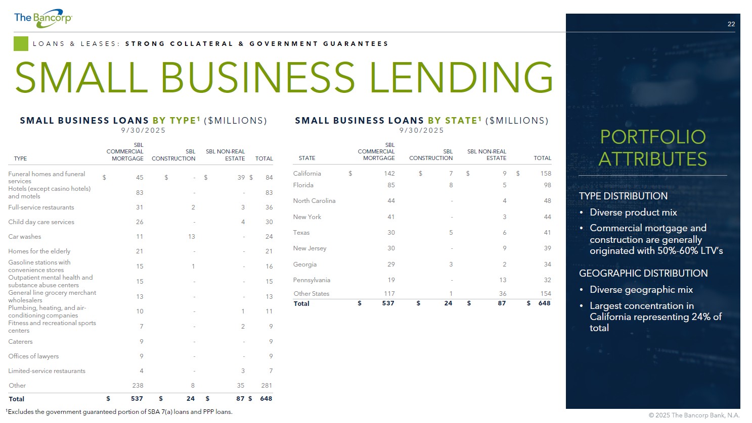 21 LOANS & LEASES: SMALL BUSINESS LENDING SMALL BUSINESS LENDING $ 1,059 M Q3 2025 PORTFOLIO SIZE 7.6 % 9/30/2025 EST. YIELD BUSINESS OVERVIEW: • Established a distinct platform within the fragmented SBA market − National portfolio approach allows pricing and client flexibility − Solid credit performance demonstrated over time − Client segment strategy tailored by market STRATEGIC OUTLOOK: • Continue delivering growth within existing small business lending platform while entering new verticals and growing the SBAlliance® • SBAlliance® program provides lending support to banks and financial institutions who need SBA lending capabilities through products such as: − Wholesale loan purchases − Vertical focus with expansion of funeral home lending program SBA AND OTHER SMALL BUSINESS LENDING ~$ 800 K AVERAGE 7(a) LOAN SIZE