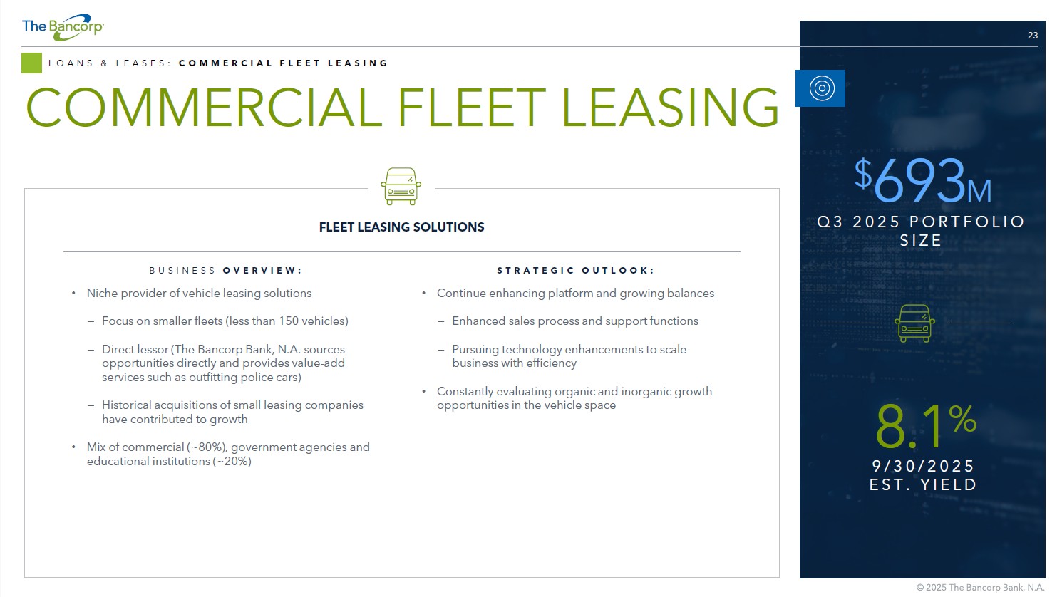 24 TOTAL BALANCE STATE 17% $ 120 Florida 9% 56 New York 8% 53 Utah 7% 48 Connecticut 6% 43 California 6% 40 Pennsylvania 5% 37 Texas 4% 30 Maryland 4% 29 New Jersey 3% 21 North Carolina 3% 19 Idaho 2% 17 Alabama 2% 16 Georgia 2% 15 Ohio 2% 13 Tennessee 20% 136 Other states 100% $ 693 Total LOANS & LEASES: COMMERCIAL FLEET LEASING PORTFOLIO COMMERCIAL FLEET LEASING • Largest concentration is government sector • Of the $693M total portfolio, $640M are vehicle leases with the remaining $53M comprised of equipment leases PORTFOLIO ATTRIBUTES TOTAL BALANCE TYPE 19% $ 131 Government agencies and public institutions 19% 130 Real estate and rental and leasing 18% 124 Construction 14% 94 Waste management and remediation services 4% 29 Health care and social assistance 4% 25 Other services (except public administration) 3% 20 Professional, scientific, and technical services 3% 19 Transit and other transportation 2% 17 Wholesale trade 2% 12 General freight trucking 2% 11 Arts, entertainment, and recreation 1% 10 Finance and insurance 9% 71 Other and non - classified 100% $ 693 Total DIRECT LEASE FINANCING BY STATE ($MILLIONS) 9/30/2025 DIRECT LEASE FINANCING BY TYPE ($MILLIONS) 9/30/2025