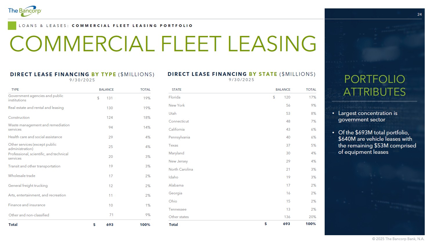 23 LOANS & LEASES: COMMERCIAL FLEET LEASING COMMERCIAL FLEET LEASING BUSINESS OVERVIEW: • Niche provider of vehicle leasing solutions − Focus on smaller fleets (less than 150 vehicles) − Direct lessor (The Bancorp Bank, N.A. sources opportunities directly and provides value - add services such as outfitting police cars) − Historical acquisitions of small leasing companies have contributed to growth • Mix of commercial (~80%), government agencies and educational institutions (~20%) STRATEGIC OUTLOOK: • Continue enhancing platform and growing balances − Enhanced sales process and support functions − Pursuing technology enhancements to scale business with efficiency • Constantly evaluating organic and inorganic growth opportunities in the vehicle space FLEET LEASING SOLUTIONS $ 693 M Q3 2025 PORTFOLIO SIZE 8.1 % 9/30/2025 EST. YIELD