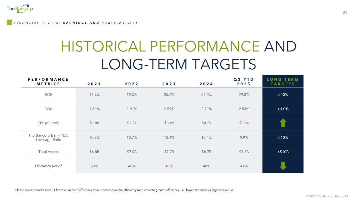 29 HISTORICAL PERFORMANCE AND LONG - TERM TARGETS FINANCIAL REVIEW: EARNINGS AND PROFITABILITY LONG - TERM TARGETS Q3 YTD 2025 2024 2023 2022 2021 PERFORMANCE METRICS >40% 29.3% 27.2% 25.6% 19.3% 17.9% ROE >4.0% 2.54% 2.71% 2.59% 1.81% 1.68% ROA $3.64 $4.29 $3.49 $2.27 $1.88 EPS (diluted) >10% 9.9% 10.4% 12.4% 10.7% 10.9% The Bancorp Bank, N.A. Leverage Ratio <$10B $8.6B $8.7B $7.7B $7.9B $6.8B Total Assets 41% 40% 41% 48% 53% Efficiency Ratio 1 1 Please see Appendix slide 31 for calculation of efficiency ratio. Decreases in the efficiency ratio indicate greater efficien cy, i.e., lower expenses vs. higher revenue.