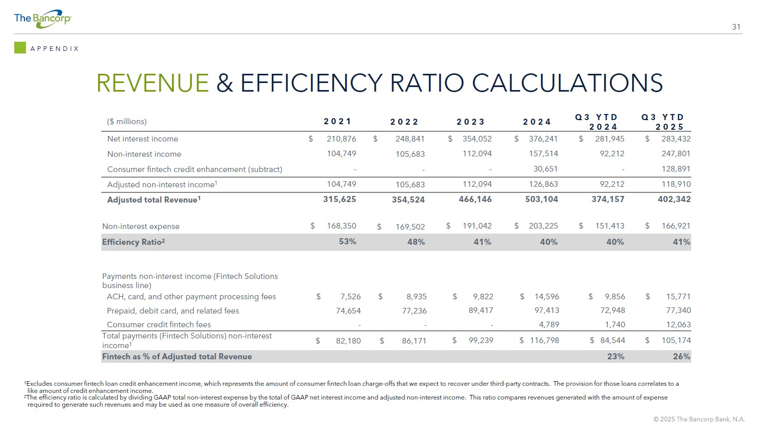 31 REVENUE & EFFICIENCY RATIO CALCULATIONS APPENDIX Q3 YTD 2025 Q3 YTD 2024 2024 2023 2022 2021 ($ millions) $ 283,432 $ 281,945 $ 376,241 $ 354,052 $ 248,841 $ 210,876 Net interest income 247,801 92,212 157,514 112,094 105,683 104,749 Non - interest income 128,891 - 30,651 - - - Consumer fintech credit enhancement (subtract) 118,910 92,212 126,863 112,094 105,683 104,749 Adjusted non - interest income 1 402,342 374,157 503,104 466,146 354,524 315,625 Adjusted total Revenue 1 $ 166,921 $ 151,413 $ 203,225 $ 191,042 $ 169,502 $ 168,350 Non - interest expense 41% 40% 40% 41% 48% 53% Efficiency Ratio 2 Payments non - interest income (Fintech Solutions business line) $ 15,771 $ 9,856 $ 14,596 $ 9,822 $ 8,935 $ 7,526 ACH, card, and other payment processing fees 77,340 72,948 97,413 89,417 77,236 74,654 Prepaid, debit card, and related fees 12,063 1,740 4,789 - - - Consumer credit fintech fees $ 105,174 $ 84,544 $ 116,798 $ 99,239 $ 86,171 $ 82,180 Total payments (Fintech Solutions) non - interest income 1 26% 23% Fintech as % of Adjusted total Revenue 1 Excludes consumer fintech loan credit enhancement income, which represents the amount of consumer fintech loan charge - offs that we expect to recover under third - party contracts. The provision for those loans correlates to a like amount of credit enhancement income. 2 The efficiency ratio is calculated by dividing GAAP total non - interest expense by the total of GAAP net interest income and adju sted non - interest income. This ratio compares revenues generated with the amount of expense required to generate such revenues and may be used as one measure of overall efficiency.
