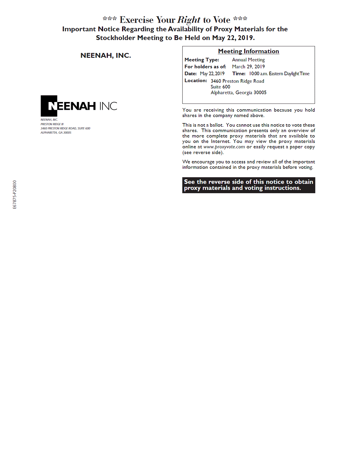 *** Exercise Your Right to Vote *** Important Notice Regarding the Availability of Proxy Materials for the Stockholder Meeting to Be Held on May 22, 2019. NEENAH, INC. You are receiving this communication because you hold shares in the company named above. This is not a ballot. You cannot use this notice to vote these shares. This communication presents only an overview of NEENAH, INC. PRESTON RIDGE III 3460 PRESTON RIDGE ROAD, SUITE 600 ALPHARETTA, GA 30005 the more complete proxy materials that are available to you on the Internet. You may view the proxy materials online at www.proxyvote.com or easily request a paper copy (see reverse side). We encourage you to access and review all of the important information contained in the proxy materials before voting. proxy materials and voting instructions. E67875-P20800 See the reverse side of this notice to obtain Meeting Information Meeting Type:Annual Meeting For holders as of:March 29, 2019 Date: May 22, 2019Time: 10:00 a.m. Eastern DaylightTime Location: 3460 Preston Ridge Road Suite 600 Alpharetta, Georgia 30005