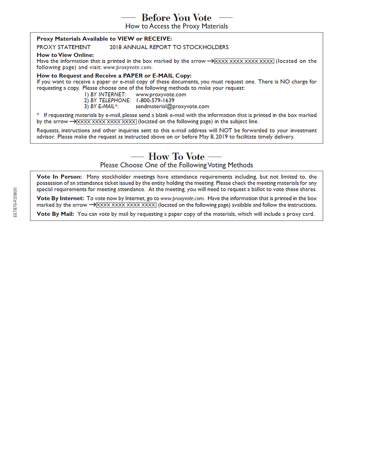 Before You Vote How to Access the Proxy Materials Have the information that is printed in the box marked by the arrow XXXX XXXX XXXX XXXX (located on the by the arrow XXXX XXXX XXXX XXXX (located on the following page) in the subject line. How To Vote Please Choose One of the Following Voting Methods marked by the arrow XXXX XXXX XXXX XXXX (located on the following page) available and follow the instructions. E67876-P20800 Vote In Person: Many stockholder meetings have attendance requirements including, but not limited to, the possession of an attendance ticket issued by the entity holding the meeting. Please check the meeting materials for any special requirements for meeting attendance. At the meeting, you will need to request a ballot to vote these shares. Vote By Internet: To vote now by Internet, go to www.proxyvote.com. Have the information that is printed in the box Vote By Mail: You can vote by mail by requesting a paper copy of the materials, which will include a proxy card. Proxy Materials Available to VIEW or RECEIVE: PROXY STATEMENT2018 ANNUAL REPORT TO STOCKHOLDERS How to View Online: following page) and visit: www.proxyvote .com. How to Request and Receive a PAPER or E-MAIL Copy: If you want to receive a paper or e-mail copy of these documents, you must request one. There is NO charge for requesting a copy. Please choose one of the following methods to make your request: 1) BY INTERNET:www.proxyvote.com 2) BY TELEPHONE: 1-800-579-1639 3) BY E-MAIL*:sendmaterial@proxyvote.com * If requesting materials by e-mail, please send a blank e-mail with the information that is printed in the box marked Requests, instructions and other inquiries sent to this e-mail address will NOT be forwarded to your investment advisor. Please make the request as instructed above on or before May 8, 2019 to facilitate timely delivery.