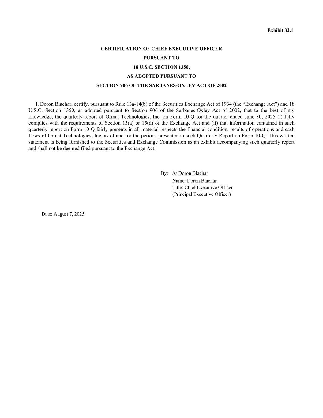 Exhibit 32.1 CERTIFICATION OF CHIEF EXECUTIVE OFFICER PURSUANT TO 18 U.S.C. SECTION 1350, AS ADOPTED PURSUANT TO SECTION 906 OF THE SARBANES-OXLEY ACT OF 2002 I, Doron Blachar, certify, pursuant to Rule 13a-14(b) of the Securities Exchange Act of 1934 (the “Exchange Act”) and 18 U.S.C. Section 1350, as adopted pursuant to Section 906 of the Sarbanes-Oxley Act of 2002, that to the best of my knowledge, the quarterly report of Ormat Technologies, Inc. on Form 10-Q for the quarter ended June 30, 2025 (i) fully complies with the requirements of Section 13(a) or 15(d) of the Exchange Act and (ii) that information contained in such quarterly report on Form 10-Q fairly presents in all material respects the financial condition, results of operations and cash flows of Ormat Technologies, Inc. as of and for the periods presented in such Quarterly Report on Form 10-Q. This written statement is being furnished to the Securities and Exchange Commission as an exhibit accompanying such quarterly report and shall not be deemed filed pursuant to the Exchange Act. By: /s/ Doron Blachar Name: Doron Blachar Title: Chief Executive Officer (Principal Executive Officer) Date: August 7, 2025