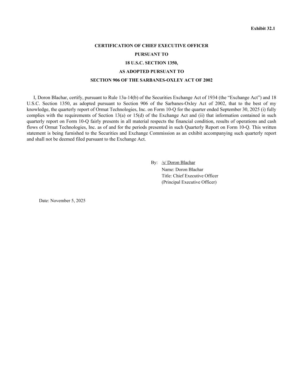 Exhibit 32.1 CERTIFICATION OF CHIEF EXECUTIVE OFFICER PURSUANT TO 18 U.S.C. SECTION 1350, AS ADOPTED PURSUANT TO SECTION 906 OF THE SARBANES-OXLEY ACT OF 2002 I, Doron Blachar, certify, pursuant to Rule 13a-14(b) of the Securities Exchange Act of 1934 (the “Exchange Act”) and 18 U.S.C. Section 1350, as adopted pursuant to Section 906 of the Sarbanes-Oxley Act of 2002, that to the best of my knowledge, the quarterly report of Ormat Technologies, Inc. on Form 10-Q for the quarter ended September 30, 2025 (i) fully complies with the requirements of Section 13(a) or 15(d) of the Exchange Act and (ii) that information contained in such quarterly report on Form 10-Q fairly presents in all material respects the financial condition, results of operations and cash flows of Ormat Technologies, Inc. as of and for the periods presented in such Quarterly Report on Form 10-Q. This written statement is being furnished to the Securities and Exchange Commission as an exhibit accompanying such quarterly report and shall not be deemed filed pursuant to the Exchange Act. By: /s/ Doron Blachar Name: Doron Blachar Title: Chief Executive Officer (Principal Executive Officer) Date: November 5, 2025