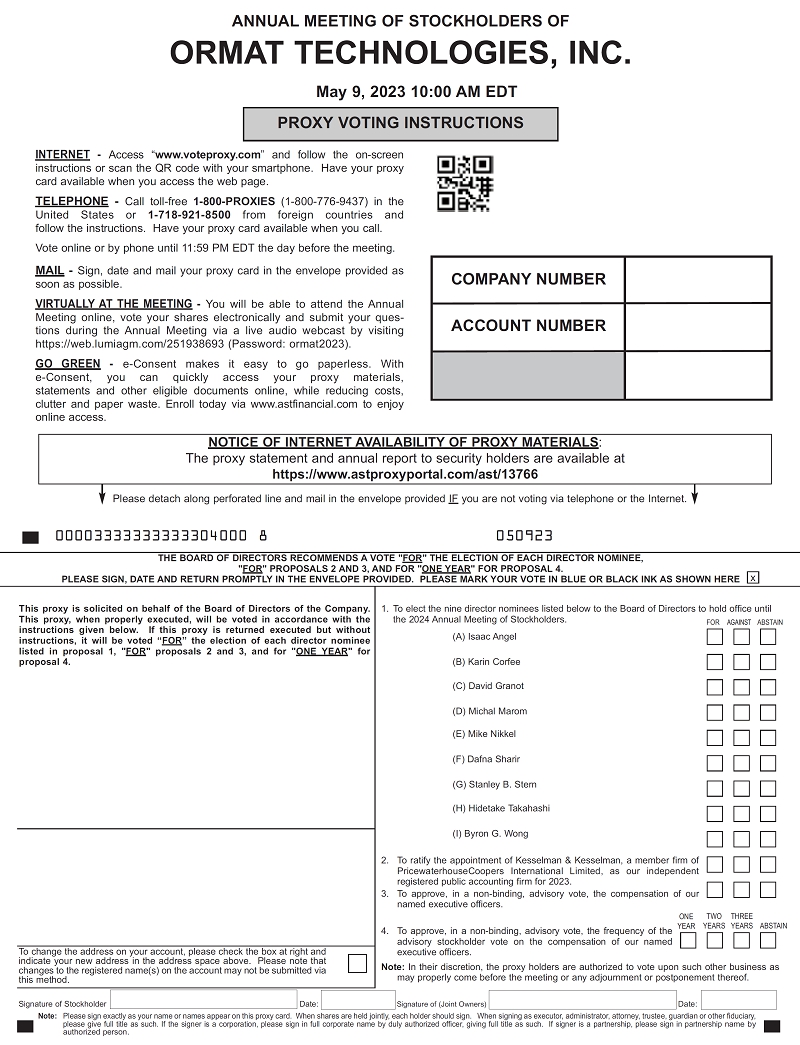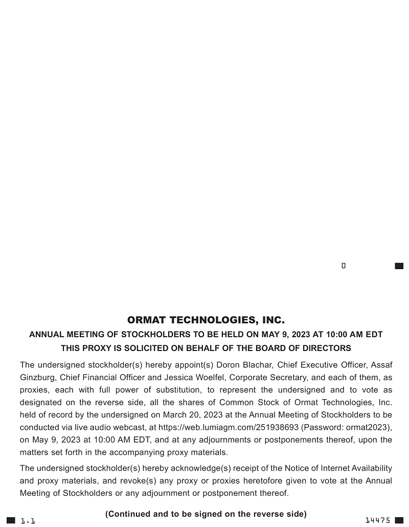 On behalf of the Board of Directors, I cordially invite you to attend the 2023 Annual Meeting of Stockholders of Ormat Technologies, Inc. to be held on May 9, 2023 at 10:00 a.m., Eastern Daylight Time (the “Annual Meeting”). The Annual Meeting will be a completely virtual meeting, conducted via live audio webcast. You will be able to attend the Annual Meeting online, vote your shares electronically and submit your questions during the Annual Meeting by visiting https://web.lumiagm.com/251938693 and following the instructions included in the enclosed Proxy Statement.
