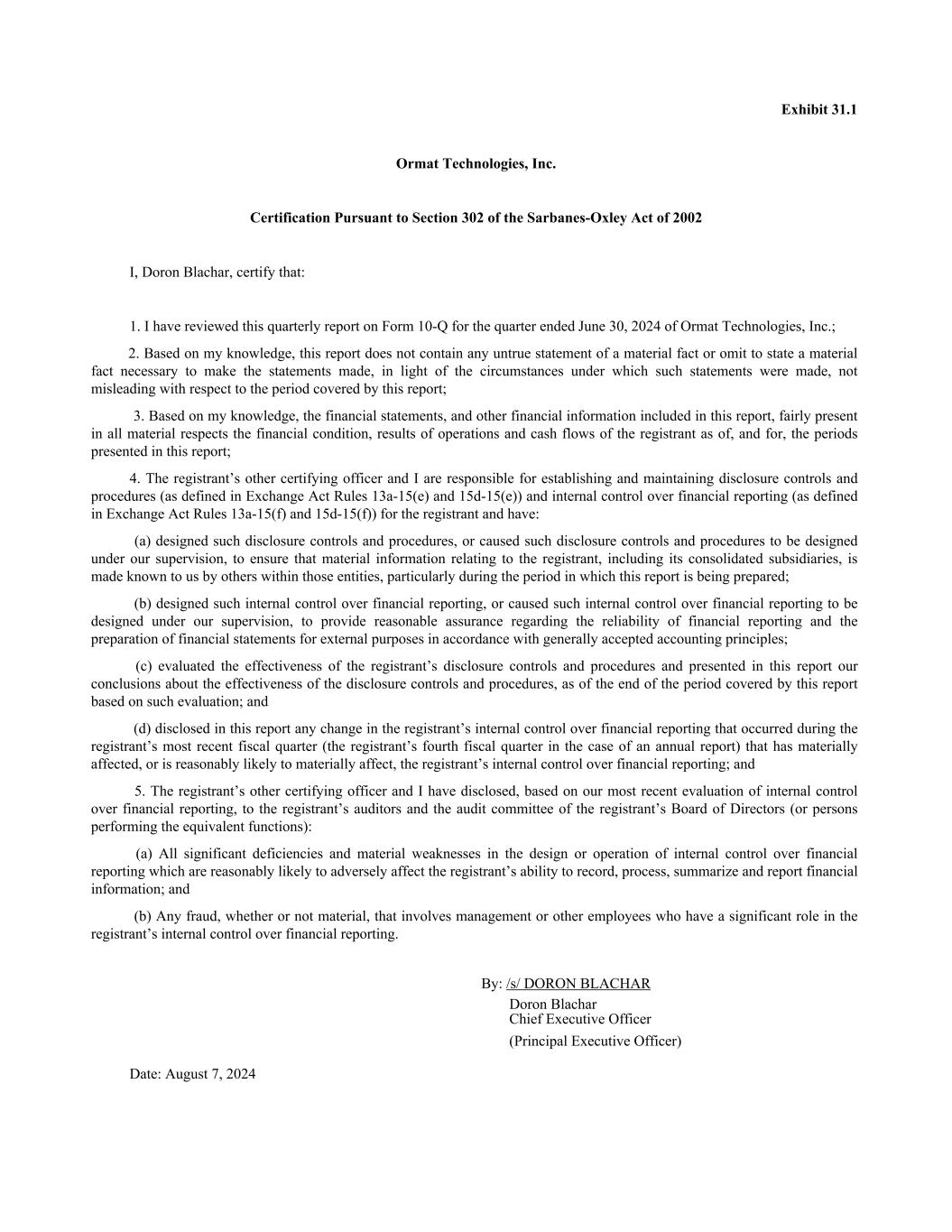 Exhibit 31.1 Ormat Technologies, Inc. Certification Pursuant to Section 302 of the Sarbanes-Oxley Act of 2002 I, Doron Blachar, certify that: 1. I have reviewed this quarterly report on Form 10-Q for the quarter ended June 30, 2024 of Ormat Technologies, Inc.; 2. Based on my knowledge, this report does not contain any untrue statement of a material fact or omit to state a material fact necessary to make the statements made, in light of the circumstances under which such statements were made, not misleading with respect to the period covered by this report; 3. Based on my knowledge, the financial statements, and other financial information included in this report, fairly present in all material respects the financial condition, results of operations and cash flows of the registrant as of, and for, the periods presented in this report; 4. The registrant’s other certifying officer and I are responsible for establishing and maintaining disclosure controls and procedures (as defined in Exchange Act Rules 13a-15(e) and 15d-15(e)) and internal control over financial reporting (as defined in Exchange Act Rules 13a-15(f) and 15d-15(f)) for the registrant and have: (a) designed such disclosure controls and procedures, or caused such disclosure controls and procedures to be designed under our supervision, to ensure that material information relating to the registrant, including its consolidated subsidiaries, is made known to us by others within those entities, particularly during the period in which this report is being prepared; (b) designed such internal control over financial reporting, or caused such internal control over financial reporting to be designed under our supervision, to provide reasonable assurance regarding the reliability of financial reporting and the preparation of financial statements for external purposes in accordance with generally accepted accounting principles; (c) evaluated the effectiveness of the registrant’s disclosure controls and procedures and presented in this report our conclusions about the effectiveness of the disclosure controls and procedures, as of the end of the period covered by this report based on such evaluation; and (d) disclosed in this report any change in the registrant’s internal control over financial reporting that occurred during the registrant’s most recent fiscal quarter (the registrant’s fourth fiscal quarter in the case of an annual report) that has materially affected, or is reasonably likely to materially affect, the registrant’s internal control over financial reporting; and 5. The registrant’s other certifying officer and I have disclosed, based on our most recent evaluation of internal control over financial reporting, to the registrant’s auditors and the audit committee of the registrant’s Board of Directors (or persons performing the equivalent functions): (a) All significant deficiencies and material weaknesses in the design or operation of internal control over financial reporting which are reasonably likely to adversely affect the registrant’s ability to record, process, summarize and report financial information; and (b) Any fraud, whether or not material, that involves management or other employees who have a significant role in the registrant’s internal control over financial reporting. By: /s/ DORON BLACHAR Doron Blachar Chief Executive Officer (Principal Executive Officer) Date: August 7, 2024