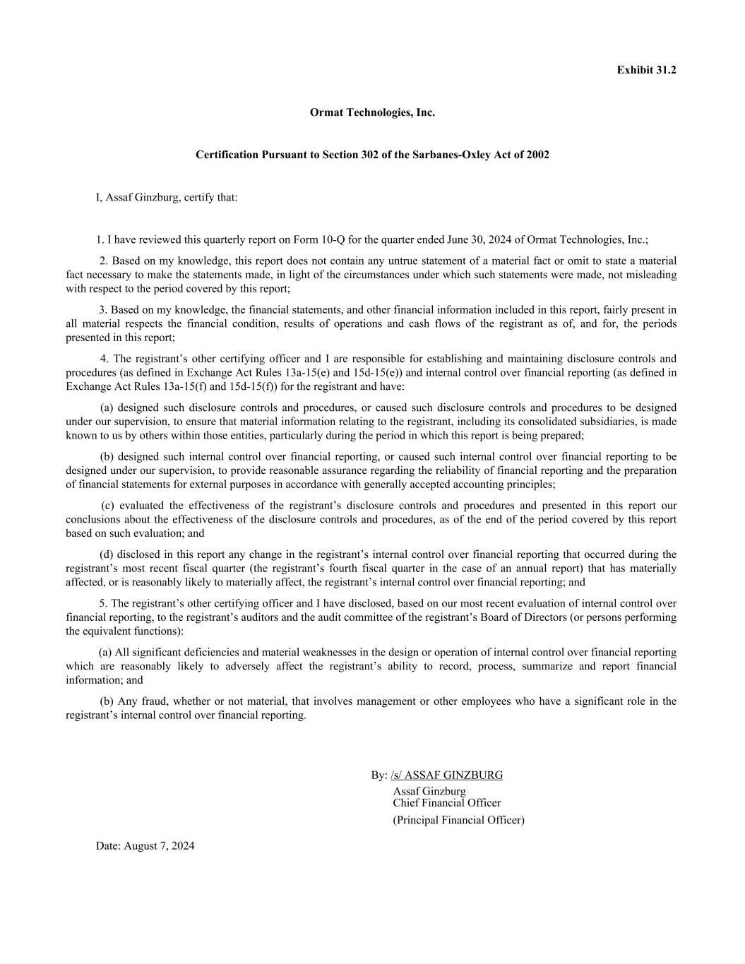 Exhibit 31.2 Ormat Technologies, Inc. Certification Pursuant to Section 302 of the Sarbanes-Oxley Act of 2002 I, Assaf Ginzburg, certify that: 1. I have reviewed this quarterly report on Form 10-Q for the quarter ended June 30, 2024 of Ormat Technologies, Inc.; 2. Based on my knowledge, this report does not contain any untrue statement of a material fact or omit to state a material fact necessary to make the statements made, in light of the circumstances under which such statements were made, not misleading with respect to the period covered by this report; 3. Based on my knowledge, the financial statements, and other financial information included in this report, fairly present in all material respects the financial condition, results of operations and cash flows of the registrant as of, and for, the periods presented in this report; 4. The registrant’s other certifying officer and I are responsible for establishing and maintaining disclosure controls and procedures (as defined in Exchange Act Rules 13a-15(e) and 15d-15(e)) and internal control over financial reporting (as defined in Exchange Act Rules 13a-15(f) and 15d-15(f)) for the registrant and have: (a) designed such disclosure controls and procedures, or caused such disclosure controls and procedures to be designed under our supervision, to ensure that material information relating to the registrant, including its consolidated subsidiaries, is made known to us by others within those entities, particularly during the period in which this report is being prepared; (b) designed such internal control over financial reporting, or caused such internal control over financial reporting to be designed under our supervision, to provide reasonable assurance regarding the reliability of financial reporting and the preparation of financial statements for external purposes in accordance with generally accepted accounting principles; (c) evaluated the effectiveness of the registrant’s disclosure controls and procedures and presented in this report our conclusions about the effectiveness of the disclosure controls and procedures, as of the end of the period covered by this report based on such evaluation; and (d) disclosed in this report any change in the registrant’s internal control over financial reporting that occurred during the registrant’s most recent fiscal quarter (the registrant’s fourth fiscal quarter in the case of an annual report) that has materially affected, or is reasonably likely to materially affect, the registrant’s internal control over financial reporting; and 5. The registrant’s other certifying officer and I have disclosed, based on our most recent evaluation of internal control over financial reporting, to the registrant’s auditors and the audit committee of the registrant’s Board of Directors (or persons performing the equivalent functions): (a) All significant deficiencies and material weaknesses in the design or operation of internal control over financial reporting which are reasonably likely to adversely affect the registrant’s ability to record, process, summarize and report financial information; and (b) Any fraud, whether or not material, that involves management or other employees who have a significant role in the registrant’s internal control over financial reporting. By: /s/ ASSAF GINZBURG Assaf Ginzburg Chief Financial Officer (Principal Financial Officer) Date: August 7, 2024