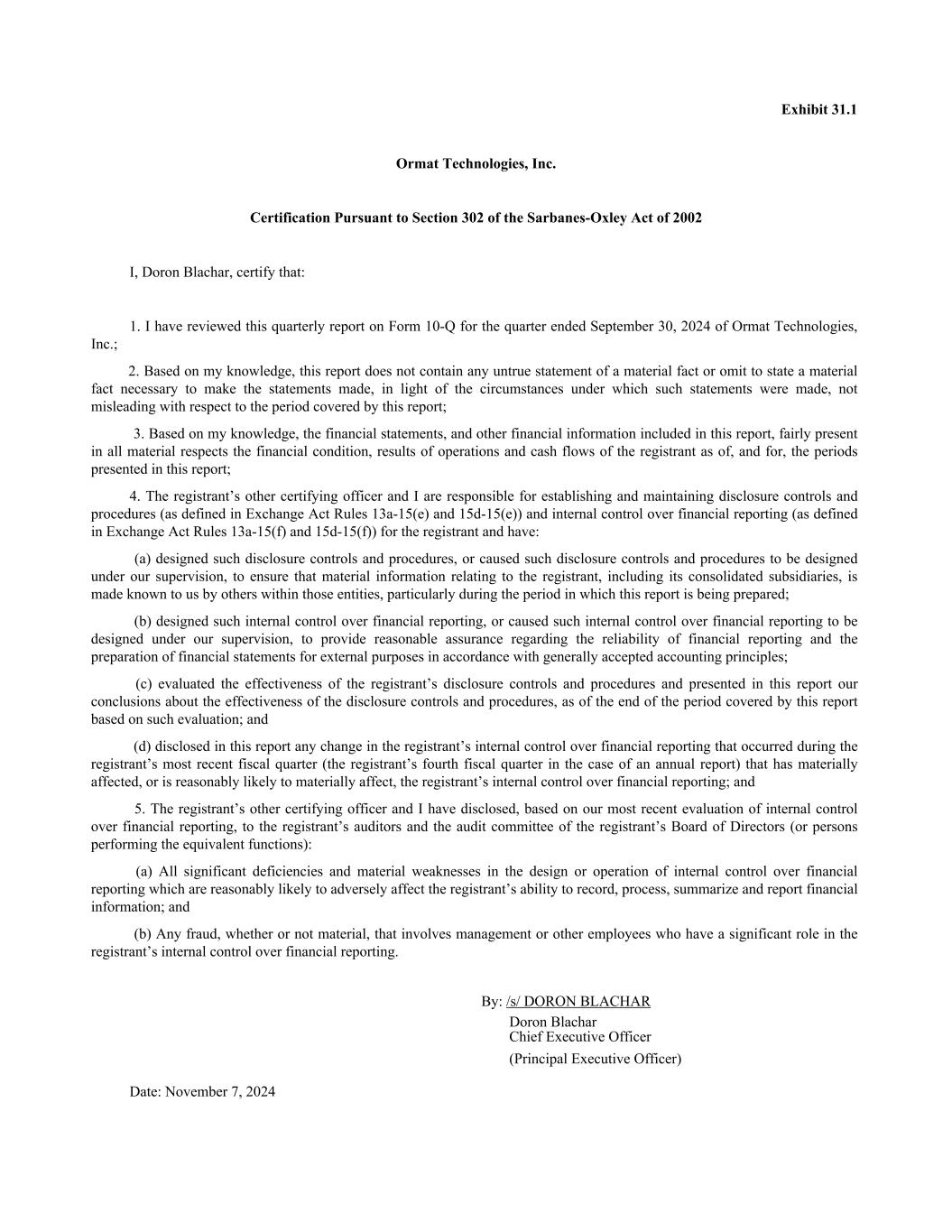 Exhibit 31.1 Ormat Technologies, Inc. Certification Pursuant to Section 302 of the Sarbanes-Oxley Act of 2002 I, Doron Blachar, certify that: 1. I have reviewed this quarterly report on Form 10-Q for the quarter ended September 30, 2024 of Ormat Technologies, Inc.; 2. Based on my knowledge, this report does not contain any untrue statement of a material fact or omit to state a material fact necessary to make the statements made, in light of the circumstances under which such statements were made, not misleading with respect to the period covered by this report; 3. Based on my knowledge, the financial statements, and other financial information included in this report, fairly present in all material respects the financial condition, results of operations and cash flows of the registrant as of, and for, the periods presented in this report; 4. The registrant’s other certifying officer and I are responsible for establishing and maintaining disclosure controls and procedures (as defined in Exchange Act Rules 13a-15(e) and 15d-15(e)) and internal control over financial reporting (as defined in Exchange Act Rules 13a-15(f) and 15d-15(f)) for the registrant and have: (a) designed such disclosure controls and procedures, or caused such disclosure controls and procedures to be designed under our supervision, to ensure that material information relating to the registrant, including its consolidated subsidiaries, is made known to us by others within those entities, particularly during the period in which this report is being prepared; (b) designed such internal control over financial reporting, or caused such internal control over financial reporting to be designed under our supervision, to provide reasonable assurance regarding the reliability of financial reporting and the preparation of financial statements for external purposes in accordance with generally accepted accounting principles; (c) evaluated the effectiveness of the registrant’s disclosure controls and procedures and presented in this report our conclusions about the effectiveness of the disclosure controls and procedures, as of the end of the period covered by this report based on such evaluation; and (d) disclosed in this report any change in the registrant’s internal control over financial reporting that occurred during the registrant’s most recent fiscal quarter (the registrant’s fourth fiscal quarter in the case of an annual report) that has materially affected, or is reasonably likely to materially affect, the registrant’s internal control over financial reporting; and 5. The registrant’s other certifying officer and I have disclosed, based on our most recent evaluation of internal control over financial reporting, to the registrant’s auditors and the audit committee of the registrant’s Board of Directors (or persons performing the equivalent functions): (a) All significant deficiencies and material weaknesses in the design or operation of internal control over financial reporting which are reasonably likely to adversely affect the registrant’s ability to record, process, summarize and report financial information; and (b) Any fraud, whether or not material, that involves management or other employees who have a significant role in the registrant’s internal control over financial reporting. By: /s/ DORON BLACHAR Doron Blachar Chief Executive Officer (Principal Executive Officer) Date: November 7, 2024